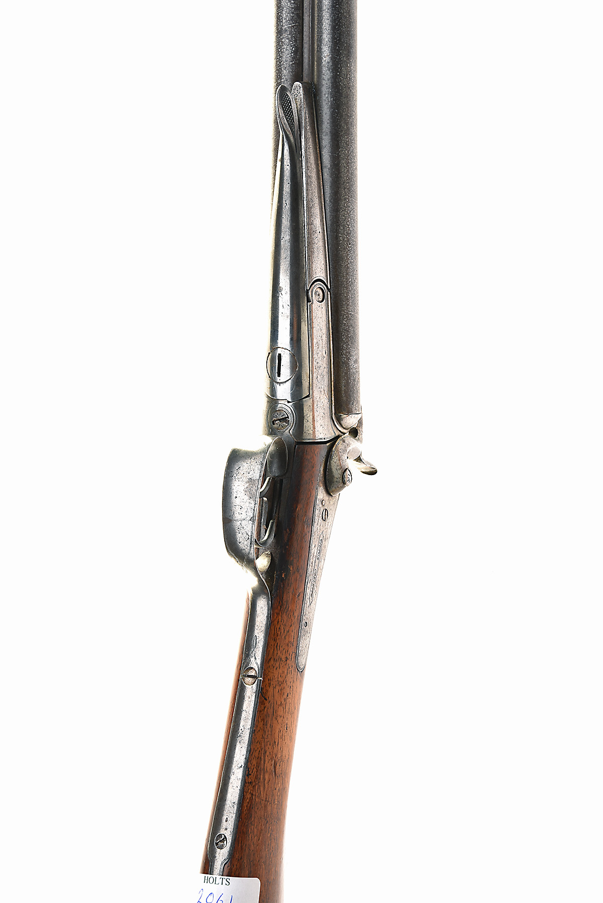 * A 16-BORE PINFIRE DOUBLE-BARRELLED SPORTING-GUN SIGNED VICTOR COLLETTE, serial no. 33982, Belgian, circa 1865, with wire damascus 30 1/4in. barrels, borderline engraved frame and locks, forward facing under-lever and walnut butt-stock (cracked) with iron splinter fore-end