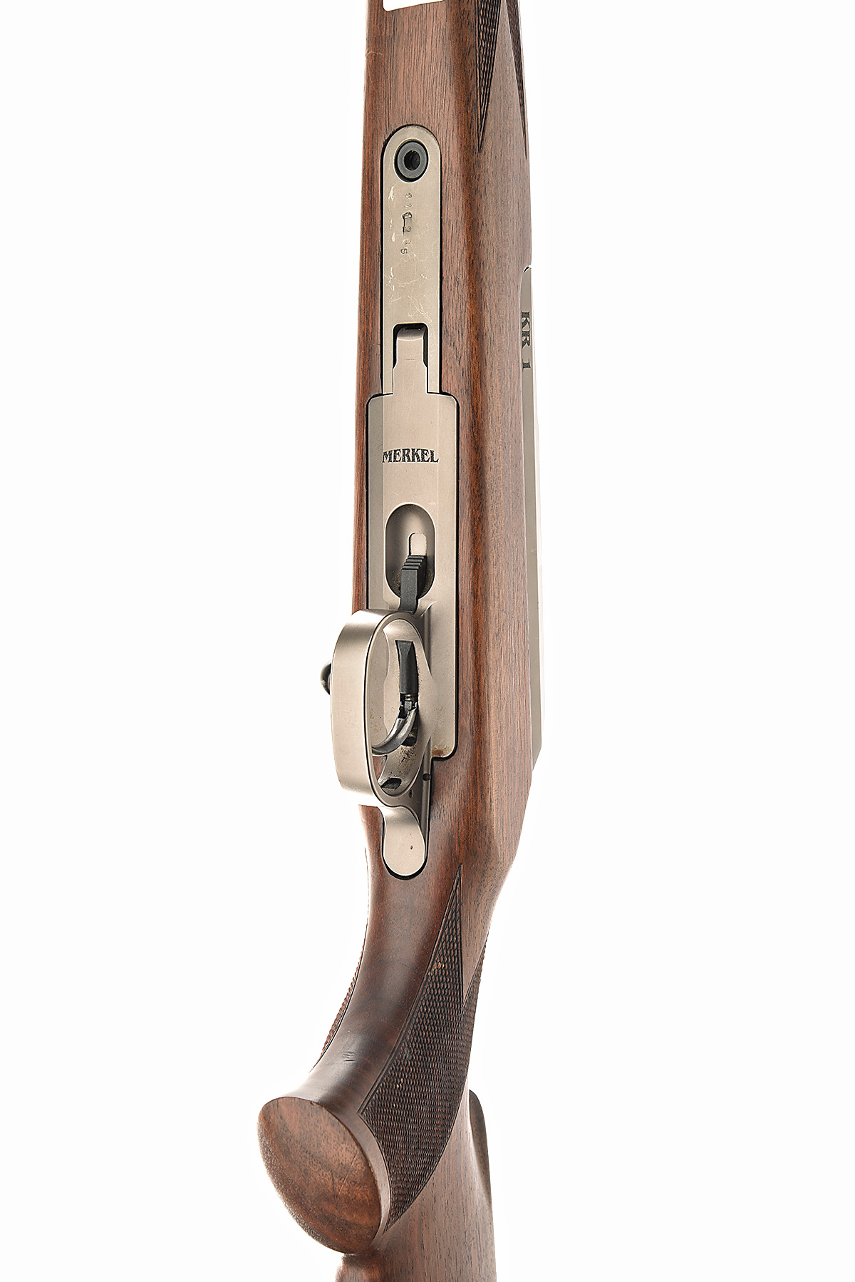 ** MERKE .243 WIN 'MODEL KR1' STANDARD' BOLT-MAGAZINE STRAIGHT PULL SPORTING RIFLE, serial no. 1-00759, circa 2005, 22 1/4in. nitro barrel, fore-sight missing, leaf rear-sight, turn-down bolt, manual safety, brushed gunmetal breech, hinged triggerplate and detachable magazine, well-figured pistolgrip stock with ventilated recoil pad, sling swivels
