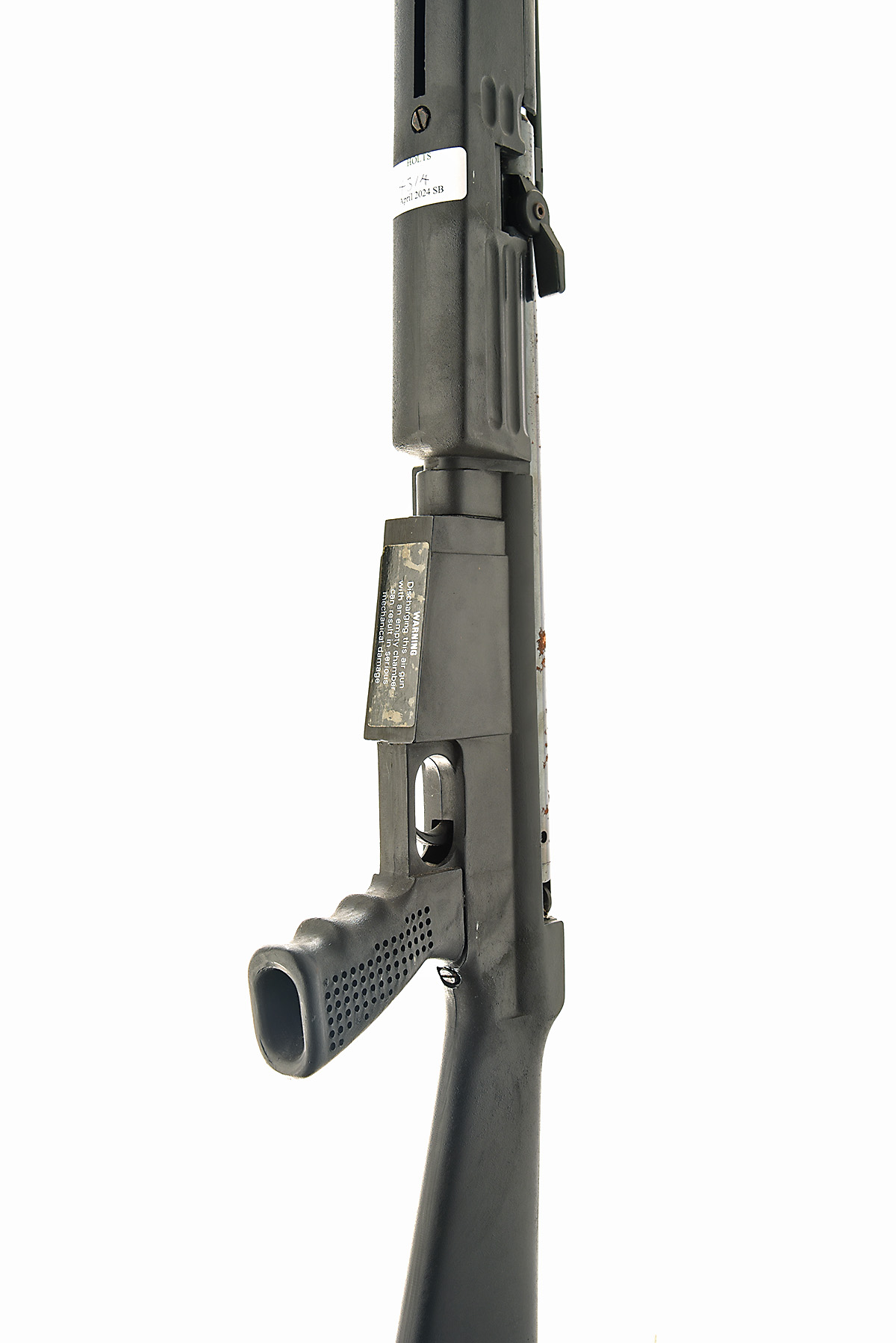 A SCARCE AIR ARMS FIREPOWER .22 SIDE-LEVER AIR-RIFLE, serial no. 15404, with blued 15 1/4in. barrel with gravity fed magazine tube above, tap-action breech, blued air-chamber and side-lever, para-military style abs plastic three-quarter stock, action slightly at fault, some fresh corrosion spots