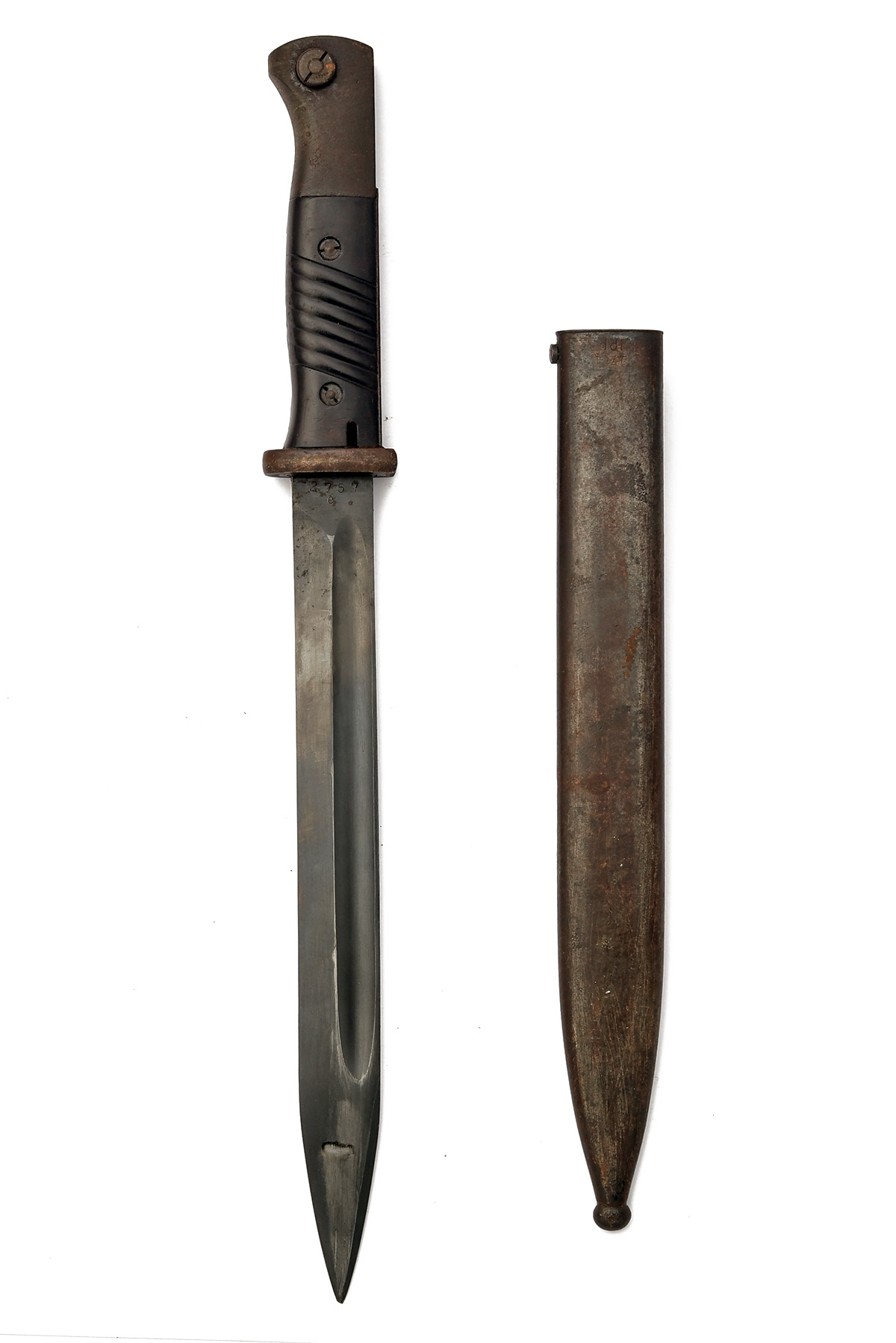 A GROUP OF THREE GERMAN THIRD REICH BAYONETS FOR THE K98k RIFLE, late 1930s-early 1940s, each with 10 in. single-edged steel blades fullered on each side together with steel scabbards, 16 in. overall; 1) ricasso marked 'KARL EICKHORN' with '8652 / e' over, wooden grips, scabbard marked at the throat '972 / d' and 'S/174 / 1937', blade good, exposed metalwork with surface rust, grips dented with losses; 2) ricasso marked 'ddl' with '2757 / e' over, Bakelite grips, scabbard with matching '2757 / e' and 'ddl / 1940' blade good, surface rust, frog stud bent and loose; 3) ricasso marked 'PAUL WEYERSBERG / & Co. / SOLINGEN', Bakelite grips, scabbard marked '2755' and '44asw', blade good, exposed metalwork rusted