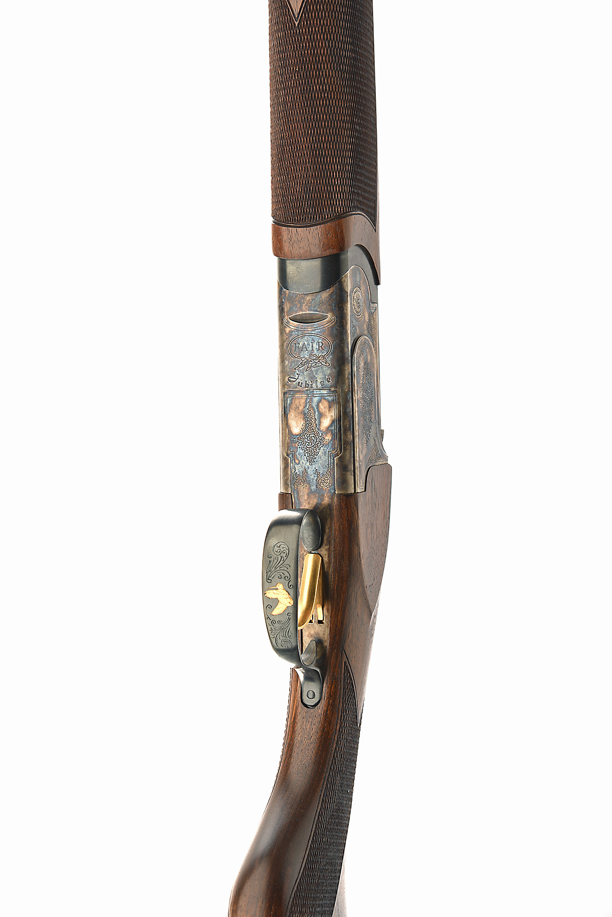 FAIR JUBILEE 28-BORE SINGLE-TRIGGER OVER AND UNDER EJECTOR, serial no. 144455, for 2001, 28in. nitro barrels with 6mm ventilated matt top-rib, 2 3/4in. chambers, multichokes (with spares), hold-open toplever with a gilt crown, automatic safety with integral barrel selector, gold-washed trigger, border and scroll engraving, cyanide hardened finish, 14 3/8in. semi-pistolgrip stock including buttplate, weight 5lb. 13oz., in its carton