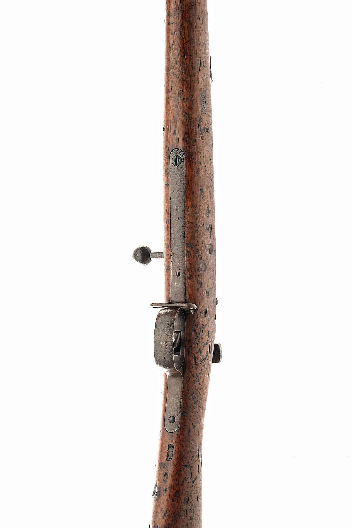 AN 11mm (MAUSER) BOLT-ACTION REPEATING RIFLE SIGNED SPANDAU, MODEL 'MAUSER M71/84', serial no. 855, dated for 1888, with blued 32in. barrel (pitted externally), block and blade fore-sight, elevating ladder rear-sight, brushed bright receiver with straight handled bolt, walnut full-stock (heavily bruised and dented), iron furniture including three barrel-bands and stacking spike to the front of the concealed magazine tube,