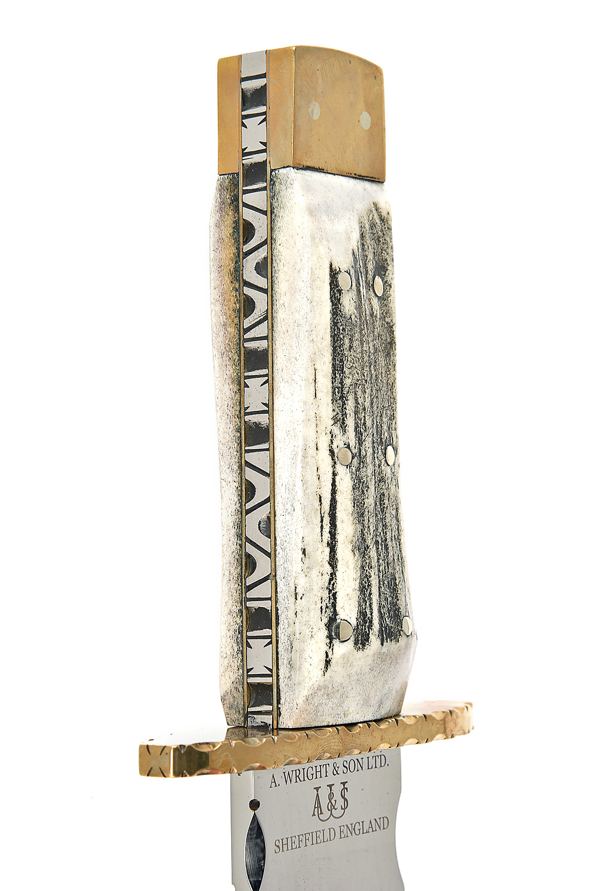 AN A. WRIGHT & SONS, SHEFFIELD BOWIE-KNIFE, with 10in. etched blade, brass furniture and bone scales, in its black leather scabbard