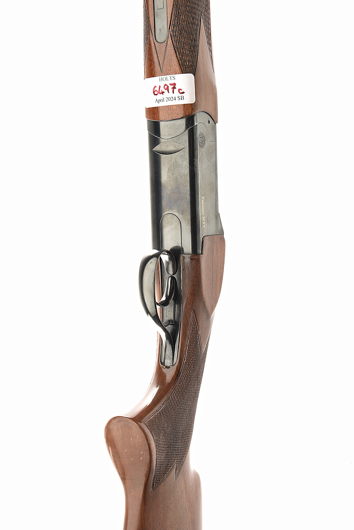 PERAZZI 12-BORE 'MX5' TRIGGERPLATE-ACTION OVER AND UNDER EJECTOR, serial no. 66237, dated 1985, 27 3/4in. nitro barrels with no mid-rib and 7mm ventilated matt top-rib, 2 3/4in. chambers, bored approx. 1/4 and 3/4 choke, hold-open toplever, manual safety with integral barrel selector switch, blued action gold-inlaid with the makers name and model designation, 14 1/4in. pistolgrip stock including 1in. rubber recoil pad, weight 7lb. 5oz., in its makers (slightly distressed) universal case