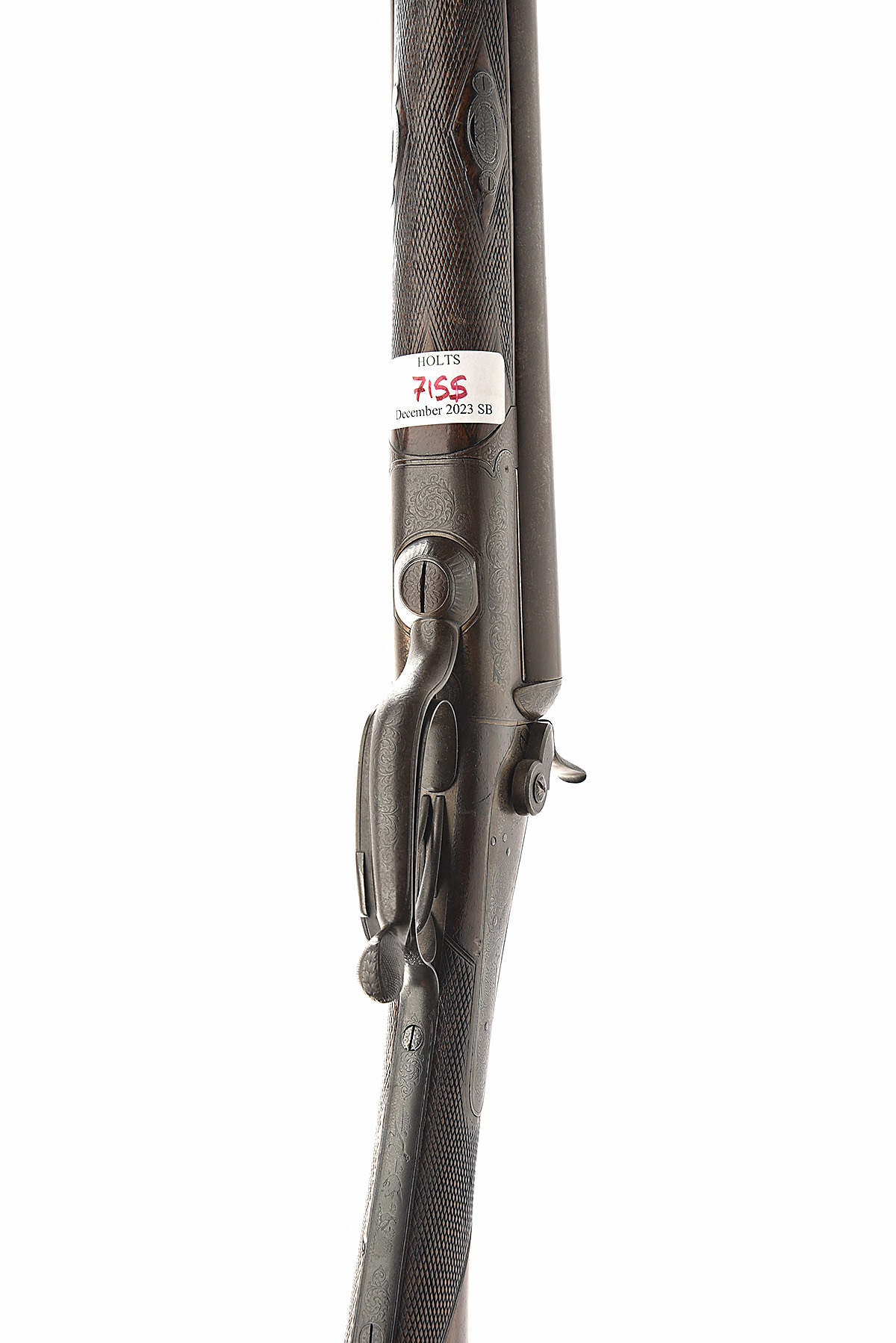 CHARLES LANCASTER 12-BORE ROTARY-UNDERLEVER SLIDE-AND-TILT HAMMERGUN, serial no. 3386, circa 1861, 26in. black powder only damascus barrels (shortened, some pits and dents), rib engraved 'CHARLES LANCASTER. 151 NEW BOND ST. LONDON. PATENT BREECH LOADER' (worn), 2 1/2in. chambers, bored approx. true cyl. in both, Charles Lancaster patent slide-and-tilt action with rotary-underlever, recessed bosses, striker discs, non-rebounding back-action locks with high-spurred hammers of hare's-ear form, the breasts of the hammers hitting the strikers, bold acanthus scroll engraving, the lockplates with 'C. LANCASTER LONDON PATENT' in scrolling banners, the action bar with 'CHARLES LANCASTER'S PATENT', the triggerguard tang with three pheasants, 14 1/4in. stock with steel buttplate (some repairs to woodwork), weight 7lb. 3oz.
