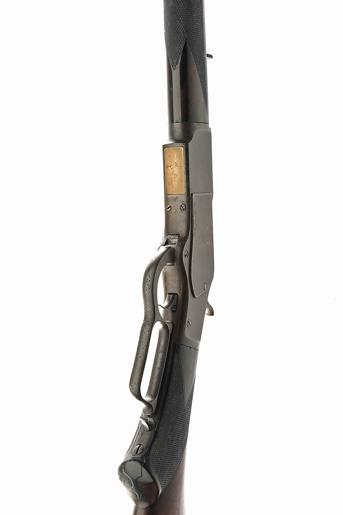 WINCHESTER REPEATING ARMS .44-40 WIN. 'MODEL 1873 SPECIAL ORDER' LEVER-ACTION REPEATING RIFLE, serial no. 195x95, serial number partially obscured, for 1886, 24in. nitro reproved octagonal barrel (in 2023), some external and internal pitting, dove-tailed blade fore-sight, open rear sight, the top flat engraved 'WINCHESTER REPEATING ARMS, NEW HAVEN, CT KINGS IMPROVEMENT PATENTED MARCH 29 1866, OCTOBER 16 1860', (faint), plain receiver with sliding dust-cover operating on internal rails, top tang marked 'MODEL 1873', some external pitting, chequered high-grade walnut pistolgrip stock, 12 3/4in. pull including iron crescent buttplate with central trap-door, chequered walnut fore-end, iron nose-cap, full-length tubular magazine, weight 8lb. 13oz.