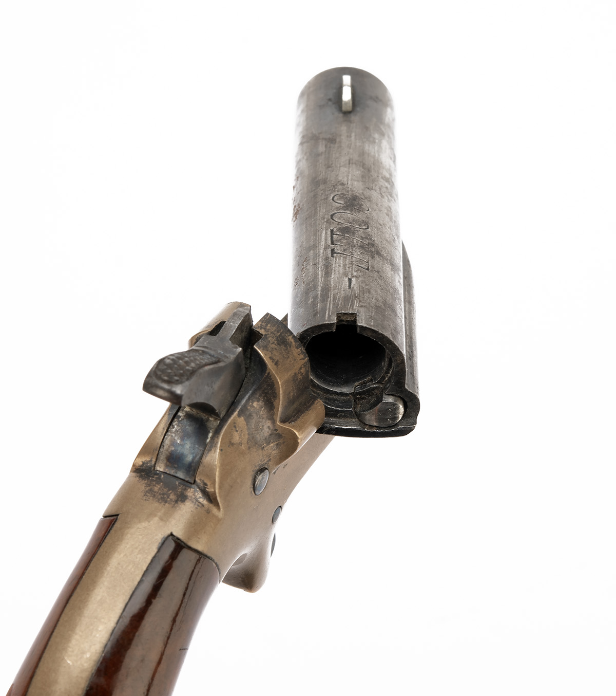 A .41 RIMFIRE COLT THUER-PATENT No.3 DERRINGER VEST-PISTOL, no visible serial number, with 2in. barrel, London roofs, steel barrel with open brass frame (marked with the stallion trademark below 'C') and smooth walnut birdshead grips