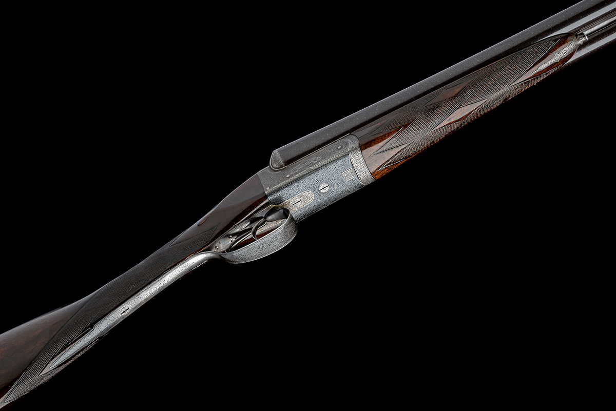 circa 1900, 30in. nitro reproved damascus barrels, rib engraved 'JOSEPH HARKOM & SON. 30. GEORGE STREET. EDINBURGH.', 2 3/4in. chambers, bored approx. true cyl. and 1/4 choke, treble-grip action with waning crescent dolls head extension, carved serpentine fences, automatic safety with inlaid 'SAFE' detail, fine acanthus scroll engraving surrounding the makers name engraved within a scrolling banner, retaining traces of original colour-hardening and finish, 15in. figured stock including 1 1/2in. extension, weight 6lb. 14oz.