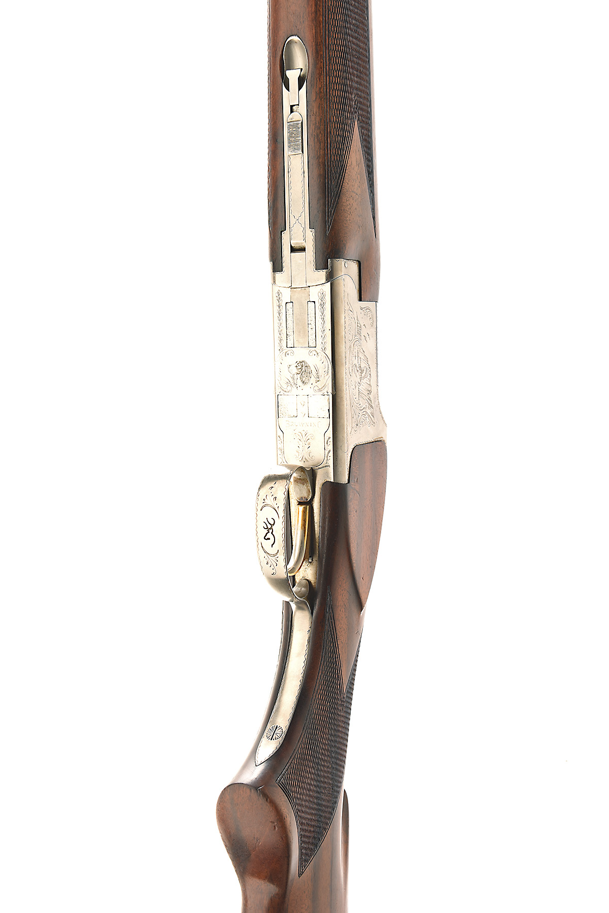 BROWNING ARMS COMPANY 12-BORE 'B.125' SINGLE-TRIGGER OVER AND UNDER EJECTOR, serial no. 251NM16571, dated 1990, 27 1/2in. nitro barrels with 6mm ventilated matt top-rib, 2 3/4in. chambers, multichokes (no spares), hold-open toplever, manual safety with integral barrel selector switch, gold-washed single trigger, border engraving surrounding game scenes, bright finish, 14 1/4in. pistolgrip stock including buttplate, weight 7lb. 1oz.