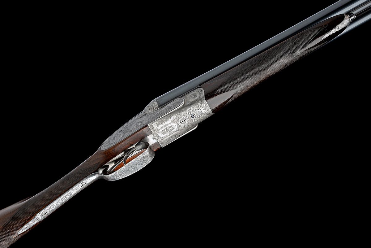 circa 1900, 27in. nitro replacement barrels (in 1964), the rib engraved 'NEW BARRELS. BY B.E. CHAPLIN. WINCHESTER.', and with acanthus scroll detailing at the breech end, 2 1/2in. chambers, bored approx. 1/4 and 1/2 choke, treble-grip action with conical fences and removable striker discs, slender toplever, automatic safety with gold-inlaid 'SAFE' detail, border, acanthus scroll and floral bouquet engraving, bright finish with reblued pins, 15in. figured stock including 1 1/8in. wooden extension, weight 5lb. 14oz.