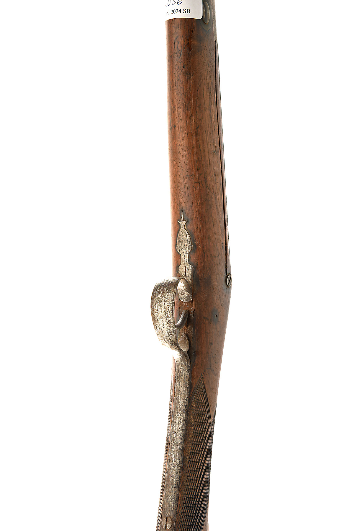 A 14-BORE PERCUSSION SINGLE-BARRELLED SPORTING-GUN SIGNED TWIGG, no visible serial number, circa 1840, with octagonal to sixteen sided to round 32in. barrel, twin gold lines at breech, borderline and scroll engraved back-action lock signed 'TWIGG', walnut half-stock (cracks and small losses to fore-end) and replacement ramrod (under-rib loose, thimbles detached but present