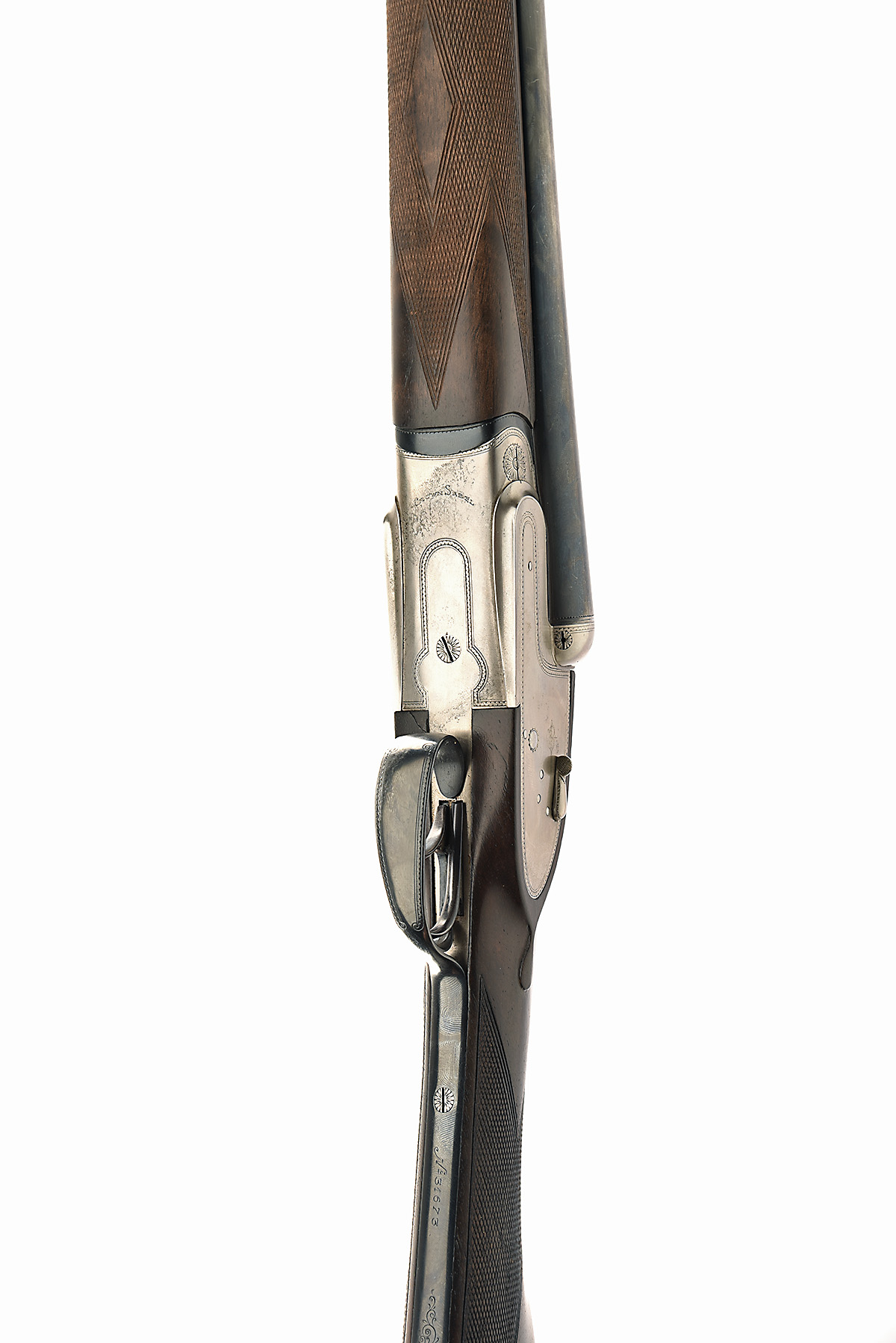 GUNMARK ARIETTA 12-BORE 'CROWN SABEL' HAND-DETACHABLE SIDELOCK EJECTOR, serial no. 31673, for 1982, 27in. nitro chopperlump barrels, 2 3/4in. chambers, bored approx. true cyl. and 1/4 choke, removable striker discs, automatic safety, hand-detachable lockplates with beaded border engraving and a central crown motif, articulated front trigger, 14 3/8in. stock (minor cracks to right underhorn, rear of lockplates and rear of top tang), weight 6lb. 10oz., in a leather case