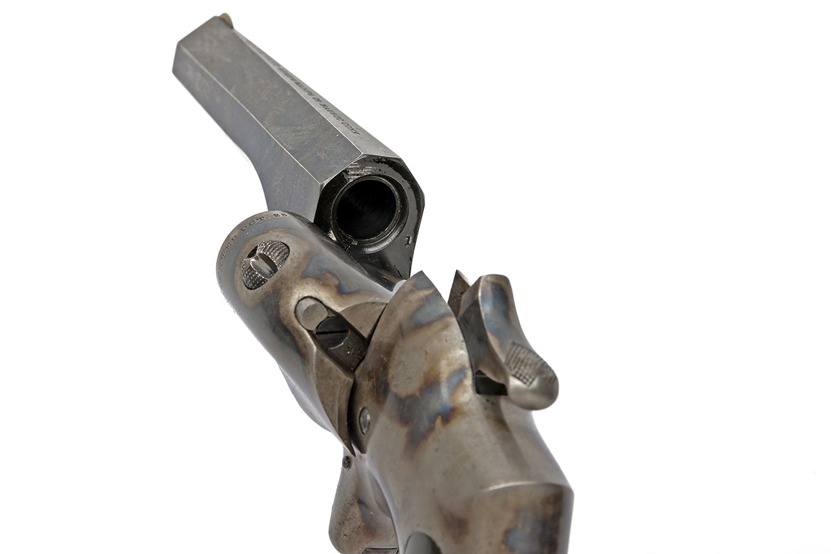 circa 1870, with blued 4in. sighted octagonal barrel, (some thinning and streaking to finish), the top flat stamped 'CONNECTICUT ARMS & MANF. CO. NAUBUC CONN', colour hardened moulded receiver, the swing sideways breech with 'PATENTED OCT 25,1864', sheath trigger and two piece chequered hard rubber grips, little used condition