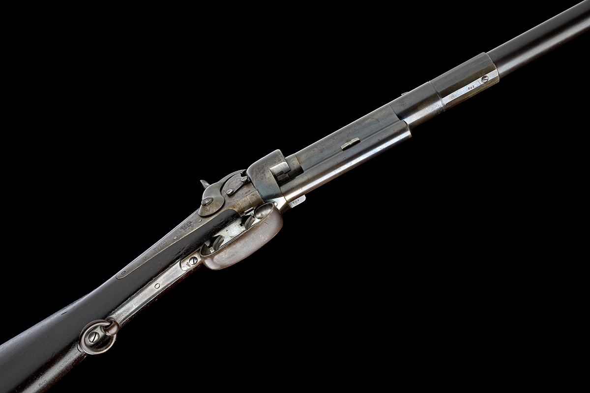 dated for 1856, with tapering round 18in. barrel, dove-tailed block and blade fore-sight, elevating ladder rear-sight, central section of outer barrel faceted for grip, plain receiver, long plain top-tang marked 'GREENE'S PATENT JUNE 27 1854', back-action lockplate fitted with Maynard's tape priming system and marked 'MASS. ARMS CO. CHICOPEE FALLS USA 1856', a 'VR' crown cypher and 'MAYNARD'S PATENT SEPT 22 1845', plain hammer, walnut butt-stock with iron patch-box and semi-crescent heel-plate, saddle-ring to the trigger-guard tang, large trigger-guard bow with two triggers, the front unlocking the barrel for loading, ordnance stamps, and no provision for fore-end, fair amount of finish remaining