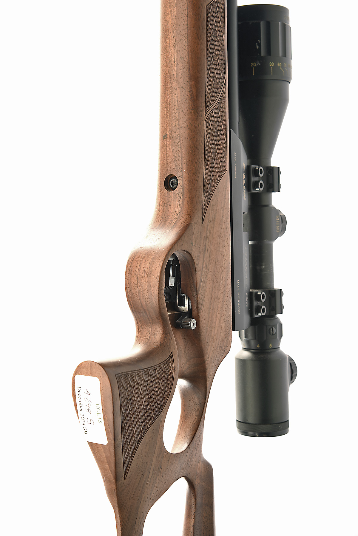 AN FAC-RATED .22 FALCON PRAIRIE-BM PRE-CHARGED PNEUMATIC AIR-RIFLE, serial no. 63266, with moderated 26 1/4in. barrel including additional detachable sound-moderator, bolt-action alloy receiver, deluxe walnut skeleton thumbhole half-stock, tested, complete with two magazines, filling probe, some spare seals and a green cordura padded gunbag plus moderator