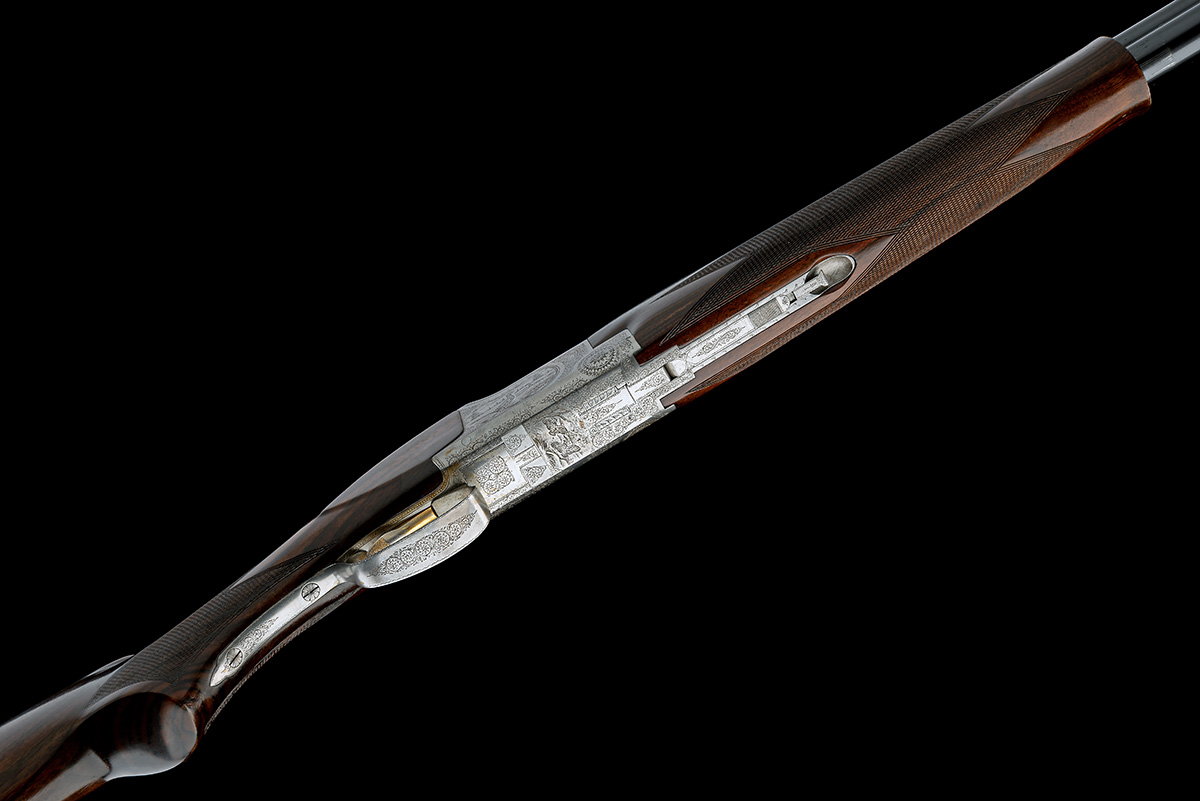 dated 1979, 27 1/2in. nitro barrels with 12mm ventilated matt top-rib, 2 3/4in. chambers, bored approx. imp. cyl. and 1/4 choke, hold-open toplever, manual safety with integral barrel selector switch, gold-washed single trigger, beaded border and acanthus scroll engraving surrounding vignettes of game, bright finish, 15 1/4in. pistolgrip stock including 1 1/4in. extension, weight 7lb. 8oz.