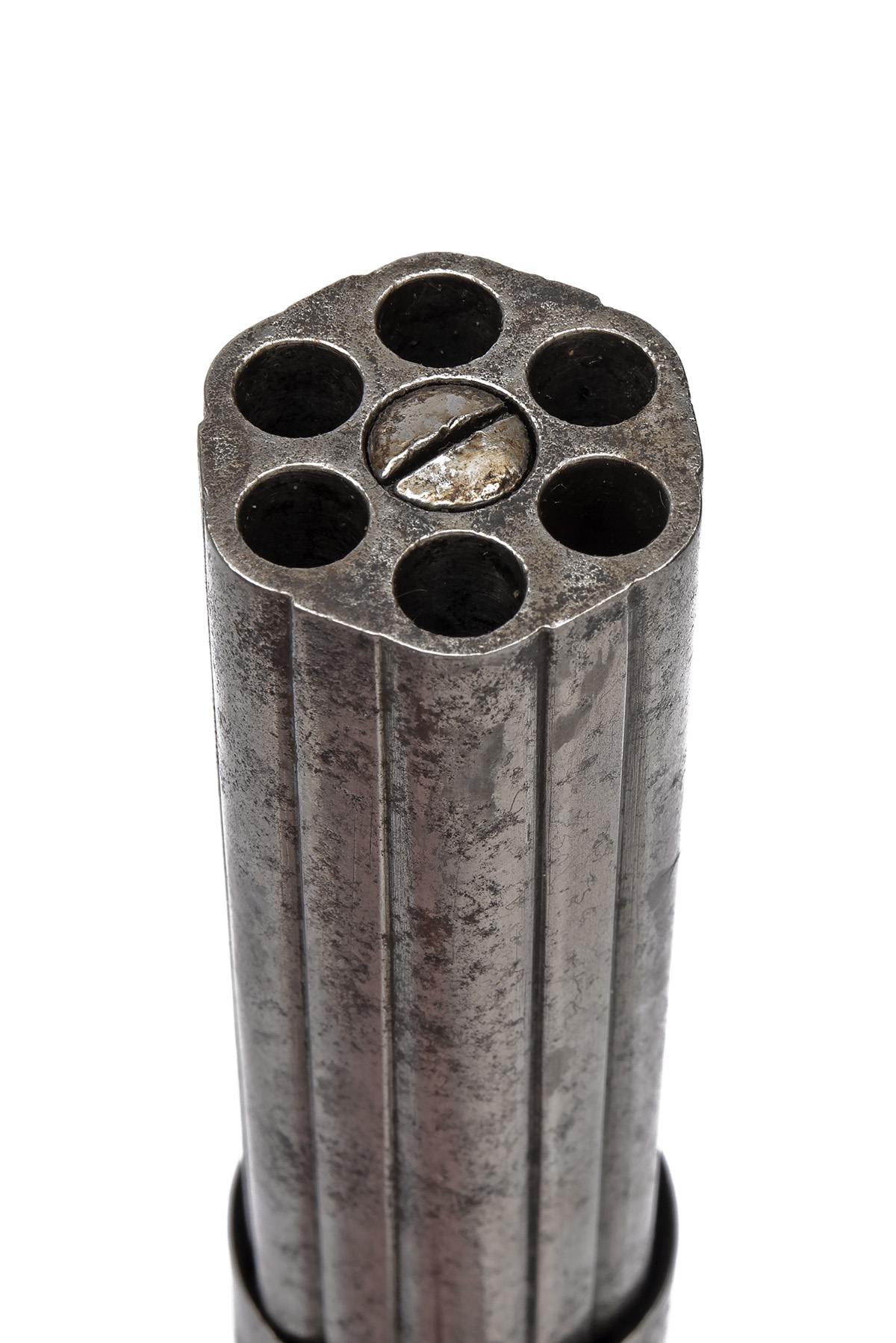 circa 1850, with ribbed 4in. six-shot barrel cluster, one rib signed 'STOCKING & CO, WORCESTER' and another 'WARRANTED CAST STEEL', integral nipples, scroll engraved nipple-shield, straight centrally-mounted long bar hammer marked 'PATENT SECURED 1848', scroll engraved rounded action with guarded trigger and smooth walnut bag-shaped grips with white-metal oval escutcheons to each side, cleaned of finish