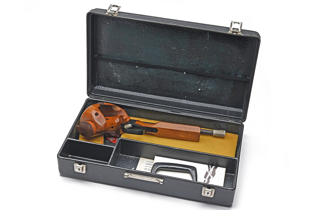 ** A CASED .22 (L/R) HAMMERLI 150 SINGLE-SHOT FREE-PISTOL, serial no. 15-0546, with blacked floating 11 1/2in. barrel, micro adjustable sights, dropping block action, anatomical walnut wrap-around grip, walnut fore-end, in its maker's hard plastic carry case (case as found)