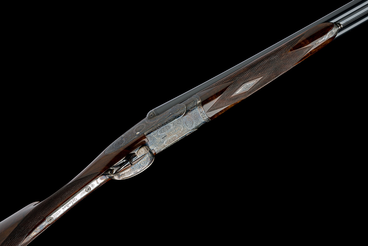 for 2019, 28in. high performance steel proof nitro chopperlump barrels, 2 3/4in. chambers, bored approx. imp. cyl. in both, round bodied action with removable striker discs, automatic safety with gold-inlaid 'SAFE' detail, Holland & Holland style self-opening system, gold-inlaid cocking-indicators, articulated front trigger set for the left, left-hand rolled-edge triggerguard, border and acanthus scroll engraving with floral bouquets, retaining much original colour-hardening and finish, 15in. figured stock (cast on for the left shoulder) including 1/2in. extension, weight 6lb. 2oz., in its makers lightweight burgundy leather guncase with canvas and leather outer