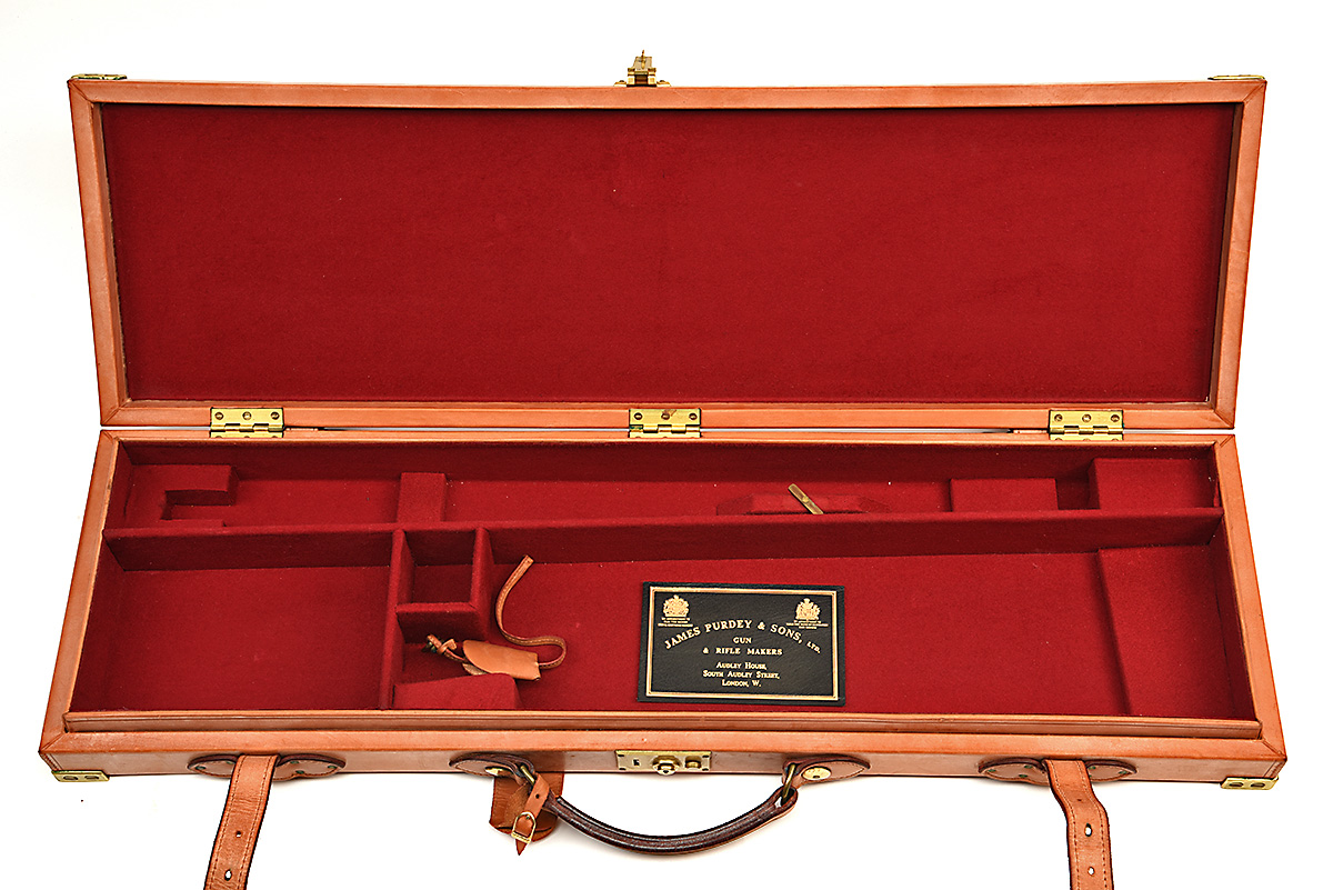 fitted for 30in. barrels, the interior lined with red baize, a leather gold-tooled James Purdey & Son Ltd trade label (detached), central brass push-button lock (including keys)