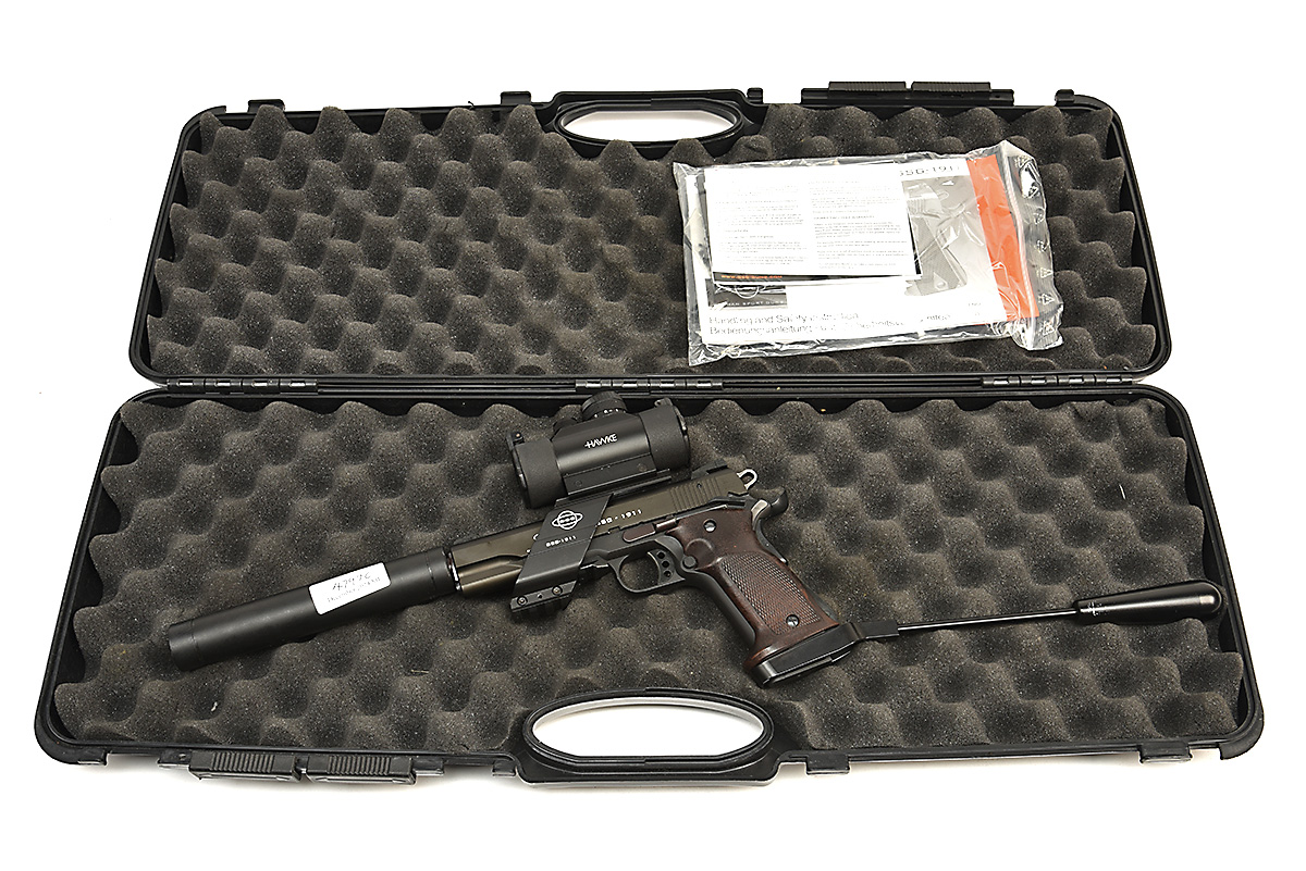 A CASED .22 (L/R) GSG 1911 LONG-BARRELLED PISTOL, serial no. A722021 with 11 7/8in. barrel, built-on dummy sound moderator, blacked frame and slide, chequered woodgrain effect wrap-around grips and permanent wrist-brace to rear, fitted with a Hawke electronic red-dot reflex sight, in its maker's abs plastic carry-case with tools and instructions