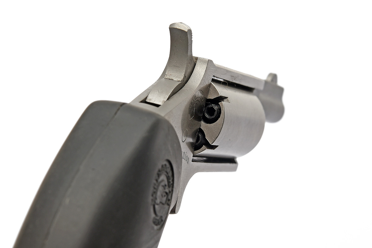 A BOXED MODERN .22 PERCUSSION NORTH AMERICAN ARMS POCKET REVOLVER, serial no. U0519, with round stainless1 1/2in. barrel, solid frame with plain five-shot cylinder, soft rubber oversized grip, appearing little used in its makers card carton with zip-up pouch , loading tools and sundry accessories