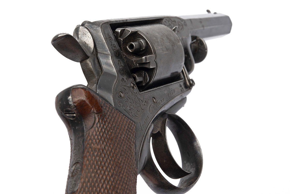 circa 1858 and being a licenced copy of the Adams, with octagonal 3 7/8in. barrel, dove-tailed fore-sight, standing notch rear-sight to the rear of the solid top-strap, the top-strap further signed 'A. FRANCOTTE A LIEGE', borderline and scroll engraved frame, plain borderline engraved five-shot cylinder with matching number, double action mechanism with spurred hammer, Kerr patent rammer and chequered walnut one-piece grip