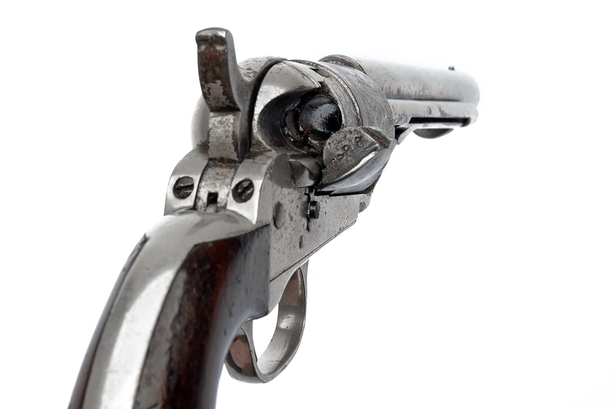 converted from percussion between 1873-75, with nickel-plated 4 1/2in. barrel, single line signature to top of barrel, rammer aperture plugged, stepped five-shot cylinder with roll engraved scene, applied standing breech with hinged loading gate, plated open frame stamped with 1871 & 2 patent dates, plated grip-straps and trigger guard, one-piece smooth walnut grip (small loss to left toe), strong amount of plated finish remaining, all matching numbers except un-numbered wedge