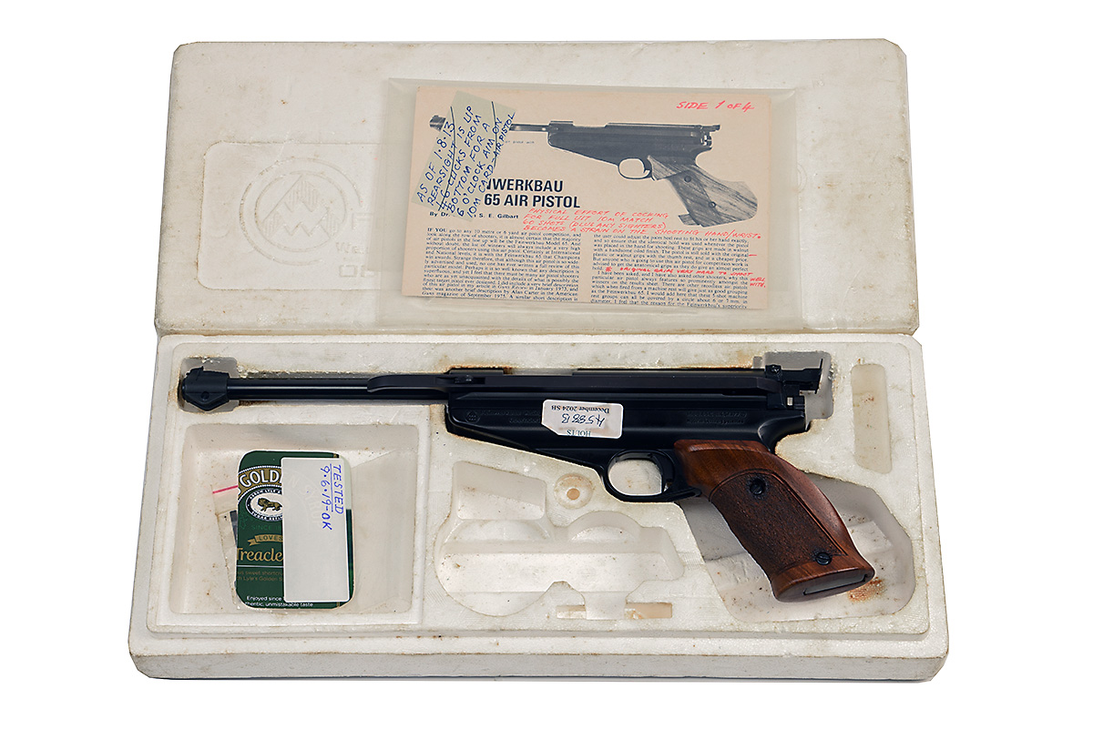 A BOXED .177 FEINWERKBAU MODEL 65 RECOILLESS SIDE-LEVER TARGET AIR-PISTOL, serial no. 78444, with blued 7 1/4in. barrel, micro adjustable sights, blacked receiver and frame, stippled walnut right hand grip, in its maker's polystyrene carton with paperwork, collector's external condition