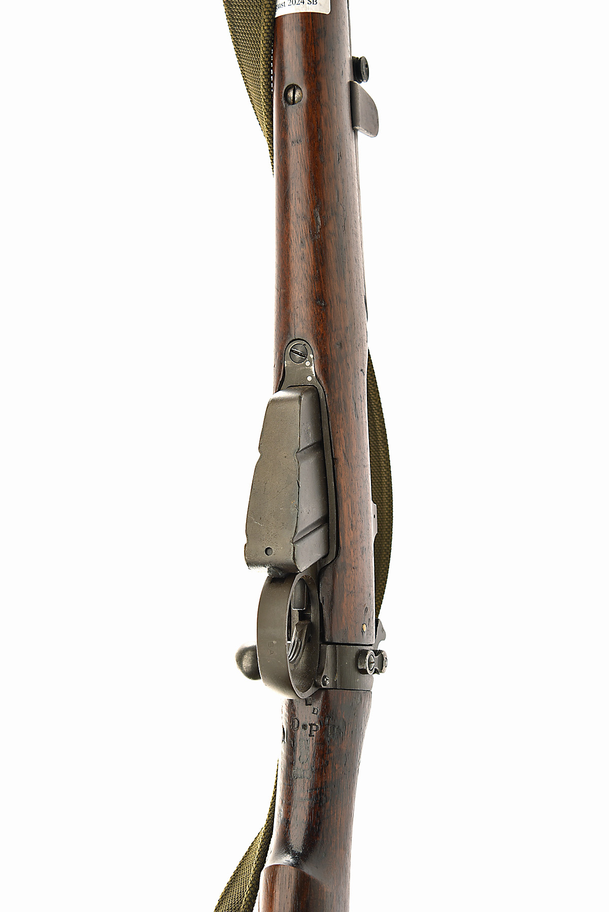 M.A. LITHGOW .303 (BRIT.) 'S.M.L.E. III*' BOLT-MAGAZINE SERVICE RIFLE, serial no. 43157, dated 1942, 25 1/4in. replacement nitro barrel, raised blade fore-sight with side protectors, adjustable tangent rear sight graduated to 2000 yards, manual safety, butt-stock collar marked 'M.A. LITHGOW. S.M.L.E. III*. 1942.', detachable box magazine, full-length stock, 13 1/4in. pull including brass buttplate with central trapdoor, canvas sling, woodwork marked 'DP'