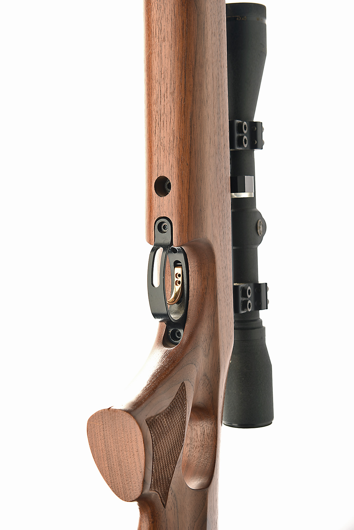 AN FAC-RATED .22 AIR ARMS S310 WALNUT THUMB-HOLE PRE-CHARGED PNEUMATIC AIR-RIFLE, serial no. 1846, with 26in. barrel including built-on sound-moderator (moderator damaged), bolt action receiver with magazine,, walnut thumb-hole right handed three-quarter stock, tested, fitted with a Simmons 4x40 telescopic sight