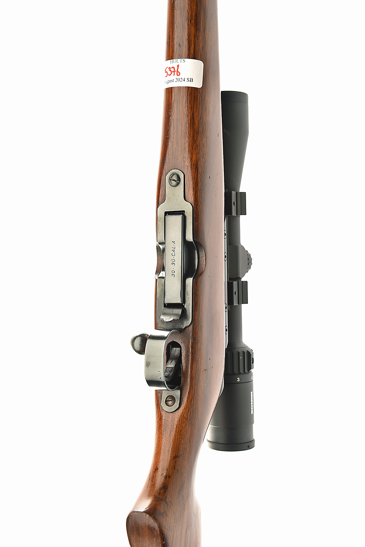 SAVAGE ARMS CORPORATION .30-30 'MODEL 340C' BOLT-MAGAZINE SPORTING RIFLE, serial no. 130853, circa 1955, 22 1/2in. nitro barrel, ramped bead fore-sight, adjustable open rear-sight, receiver fitted with a Minox 2-7x35 ZL3 telescopic sight on a side mount, manual safety, detachable box magazine, pistolgrip halfstock, 13 1/2in. pull including buttplate, sling eyes