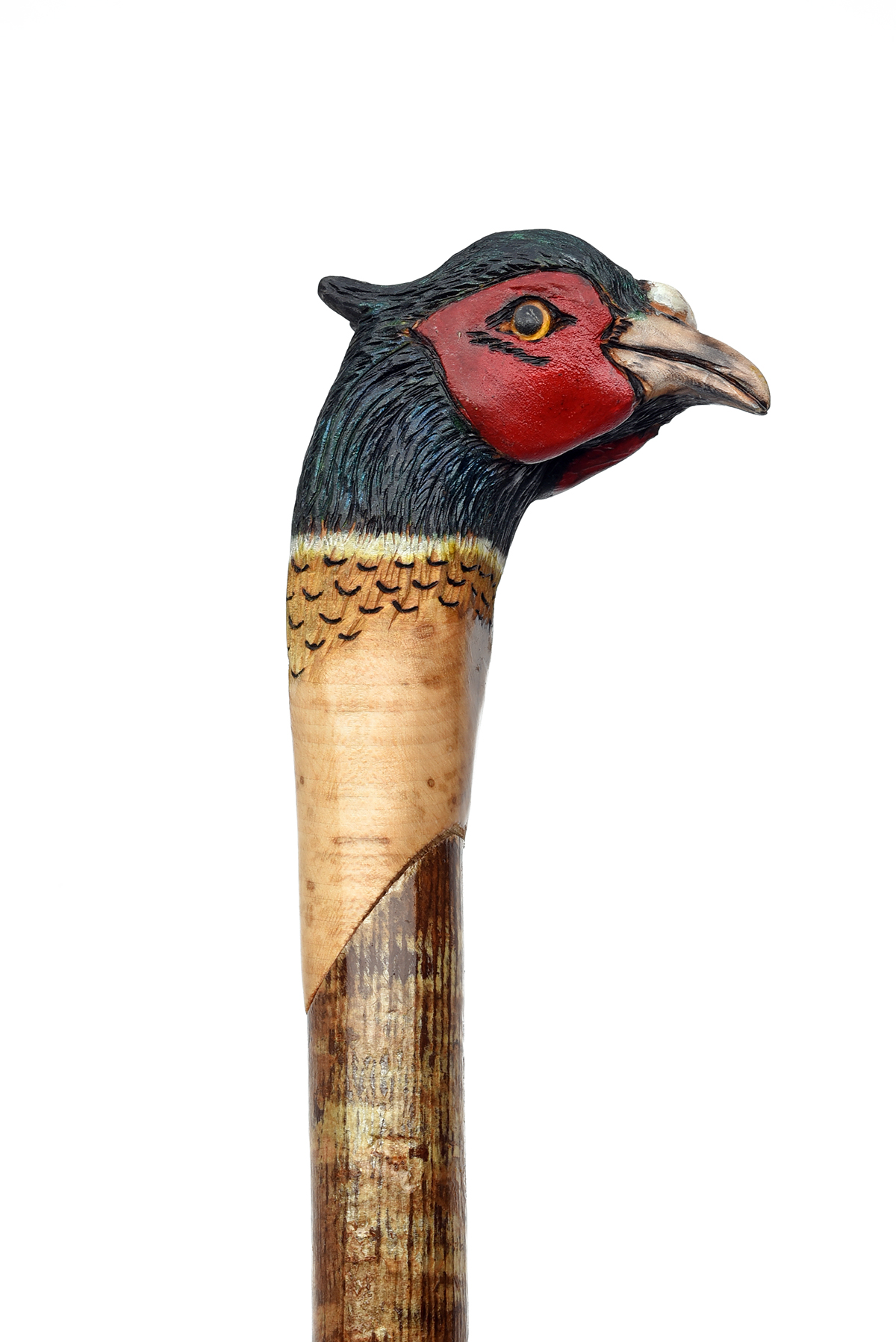 A FINE IAN JAMES HAND-CARVED SPORTSMAN'S STAFF, with hardwood shaft, the top carved and painted in the form of a pheasant head, measuring approx. 48 1/2in. in length