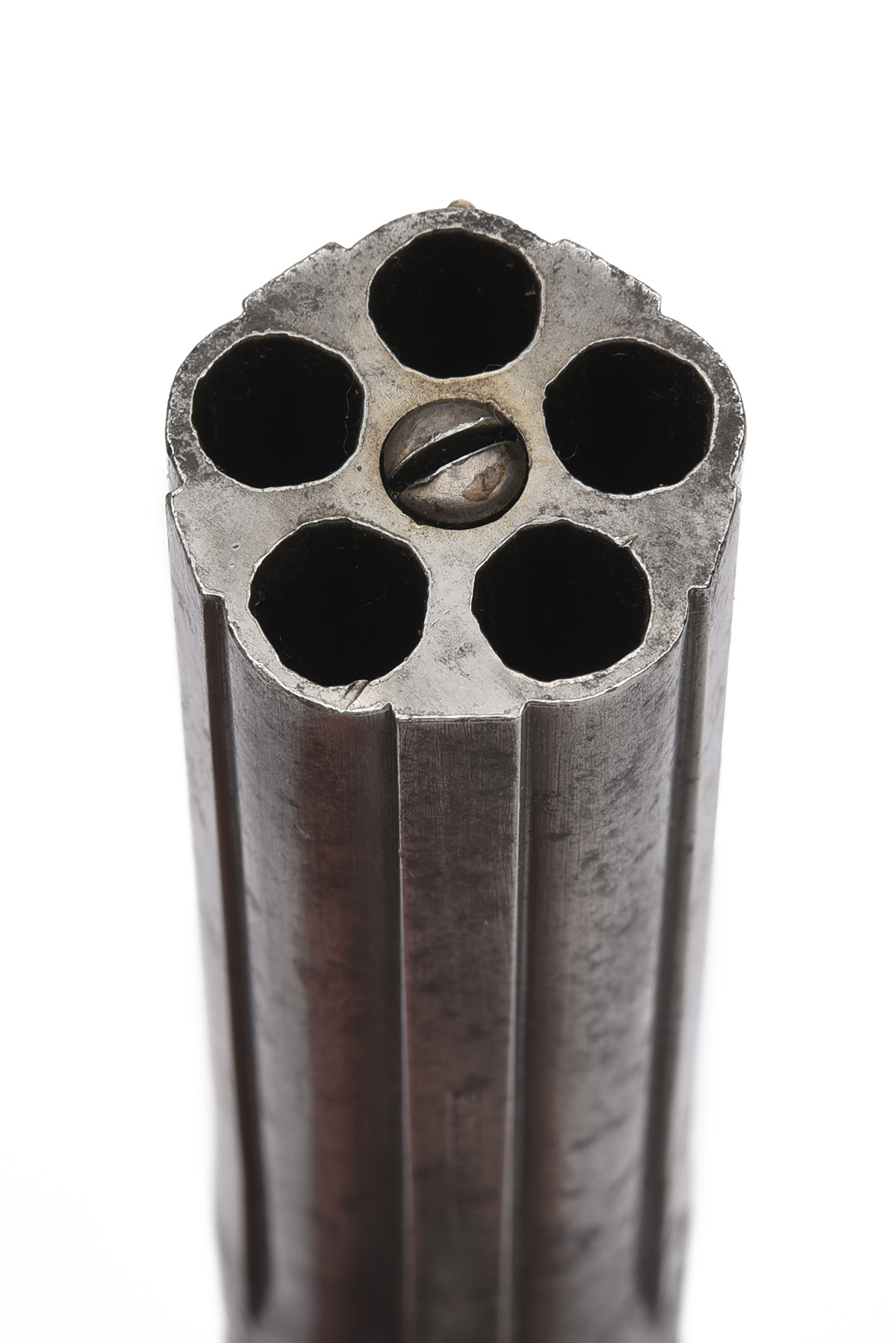 for between 1851-54, with turn-off rifled 3in. five-shot barrel group, one of the false ribs signed 'PATENT 1849', scroll engraving to the breech-end and action body, the radiused action with octagonal front section, the top with push button barrel release, the barrels hinging down for capping, single-action ring cocking trigger with additional trigger to front, saw-handled frame with rear-mounted cocking indicator and smooth hardwood grips, traces of finish
