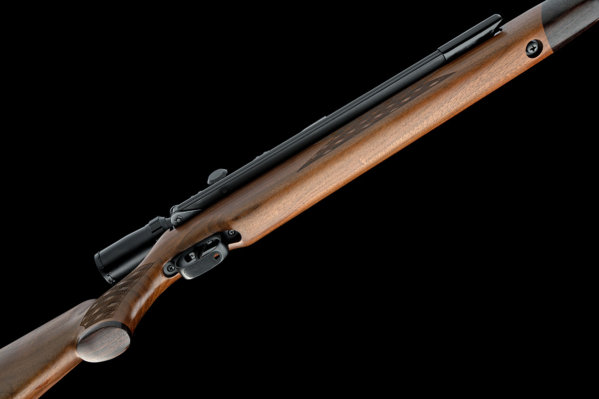 date coded for November 2003, with blued 17 1/2in. barrel, offset muzzle with blade fore-sight sliding on a ramp, adjustable rear-sight, sliding breech, blued air-chamber with applied telescopic sight rail, fitted with a Burris 3-9x32 telescopic sight, push-pull safe to rear, side-lever cocking and skip-chequered deluxe walnut three-quarter stock with rubber heel-plate and contrasting wood grip-cap and nose-piece, appearing unused, the whole in an abs plastic Gun Guard travel-case