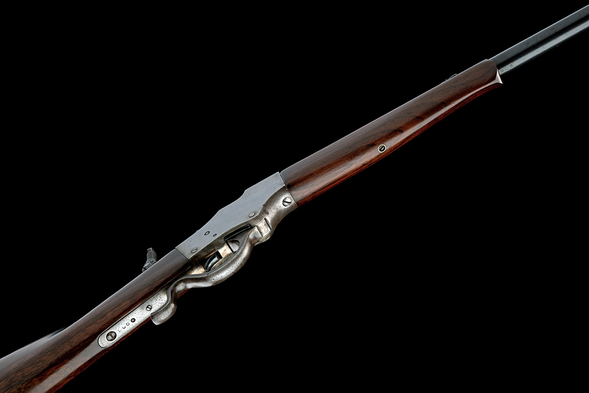 circa 1915, with blued octagonal to round 24in. barrel, folding ring fore-sight, folding twin-blade rear-sight, the top-flat signed 'J. STEVENS A & T CO. CHICOPEE FALLS MASS. USA PAT. APR. 17 94', slab-sided action (the sides cleaned of finish) with under-lever operation and central hammer, period Lyman marked adjustable peep-sight to top-tang, walnut butt-stock and shaped fore-end, good amount of finish except where noted