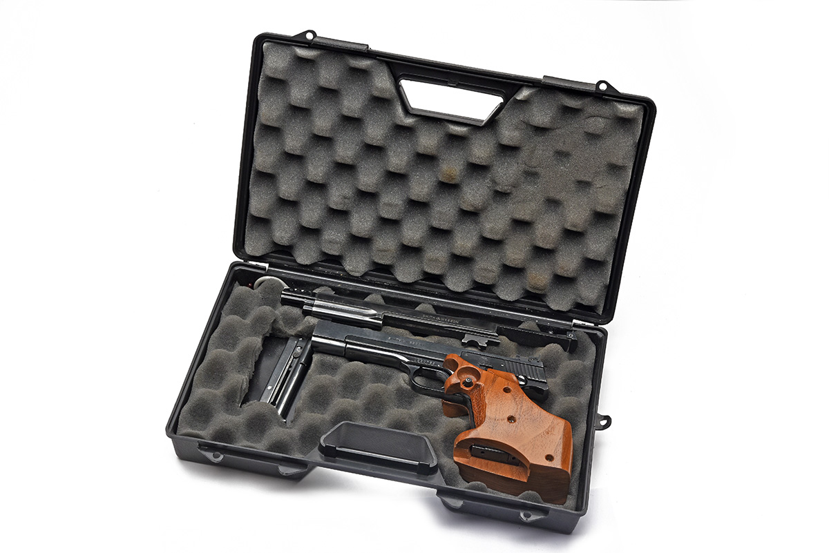 A CASED .22 (L/R) SMITH & WESSON MODEL 41 TARGET-PISTOL WITH TWO SETS OF BARRELS, serial no. A290765, with blued 5 1/2in bull barrel and 8 3/8in. barrel with alloy compensator, adjustable sights, blued frame and chequered walnut anatomical right-hand grip, in an MTM Case-Gard 808 carry-case, much finish throughout
