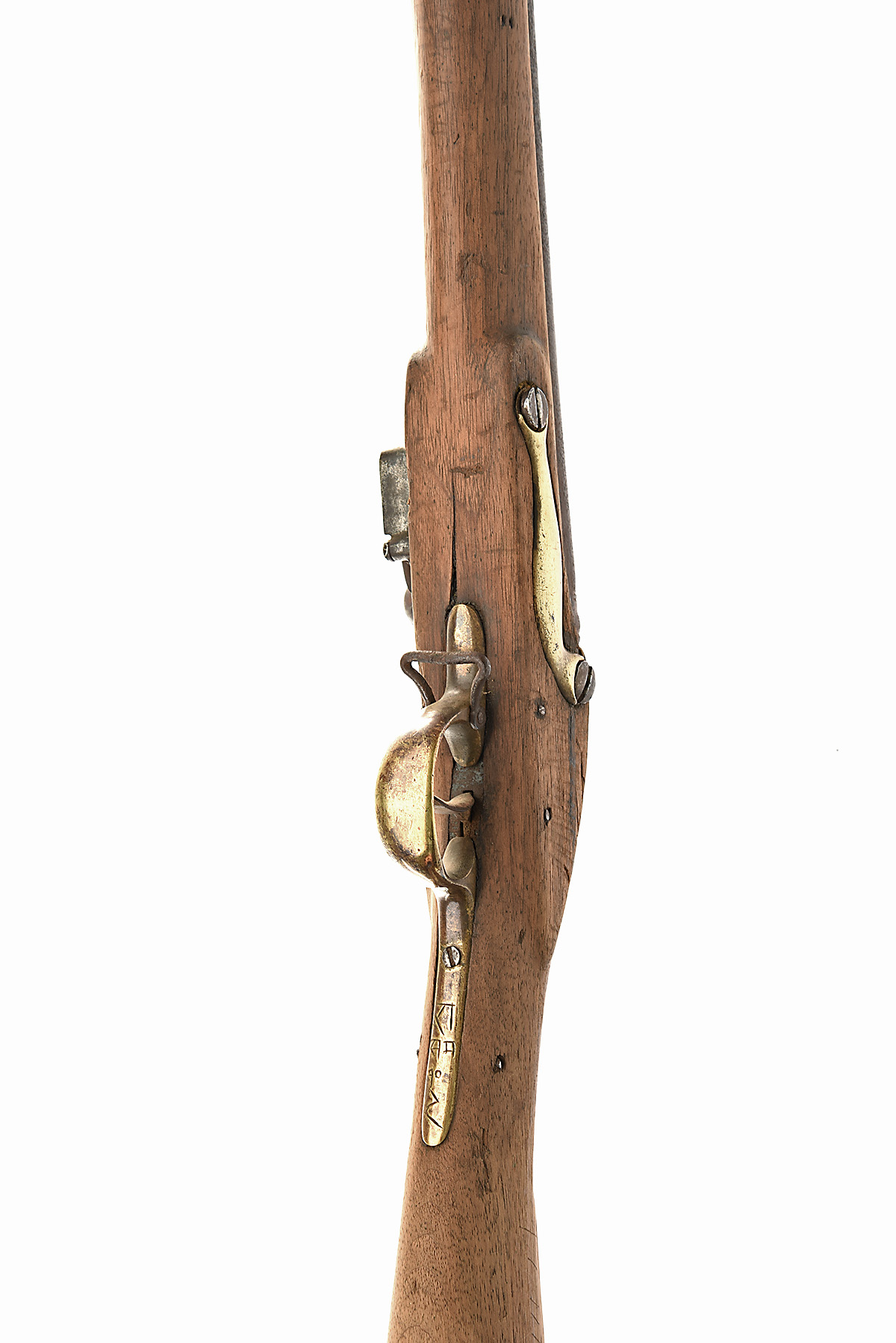 A .750 FLINTLOCK EAST INDIA COMPANY BROWN-BESS MUSKET SIGNED BAKER, no visible serial number, dated for 1805, with round iron 39in. barrel (currently partially obstructed), signed lock dated at the tail together with the E.I.C. heart trademark, walnut full-stock (cleaned of finish, small losses), brass furniture and iron ramrod (frozen)