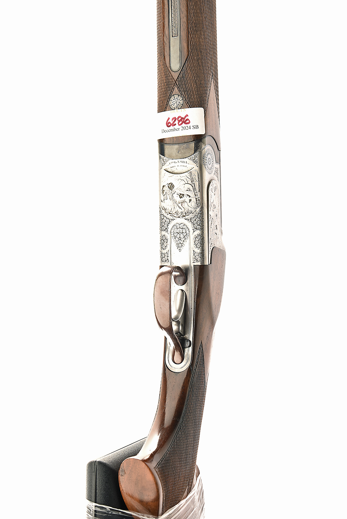 FLLI. GAMBA ARMI 12-BORE DETACHABLE-TRIGGERPLATE ACTION OVER AND UNDER EJECTOR, serial no. 80762, dated 1988, 30in. nitro barrels with ventilated mid-rib and 10mm ventilated matt top-rib, 2 3/4in. chambers, multichokes (with spares), hold-open toplever, manual safety, trigger with barrel selector switch, triggerplate with manual release catch, partial acanthus scroll engraving with game scenes, 14 1/4in, pistolgrip stock (cracked at hand) including 1/2in. rubber recoil pad