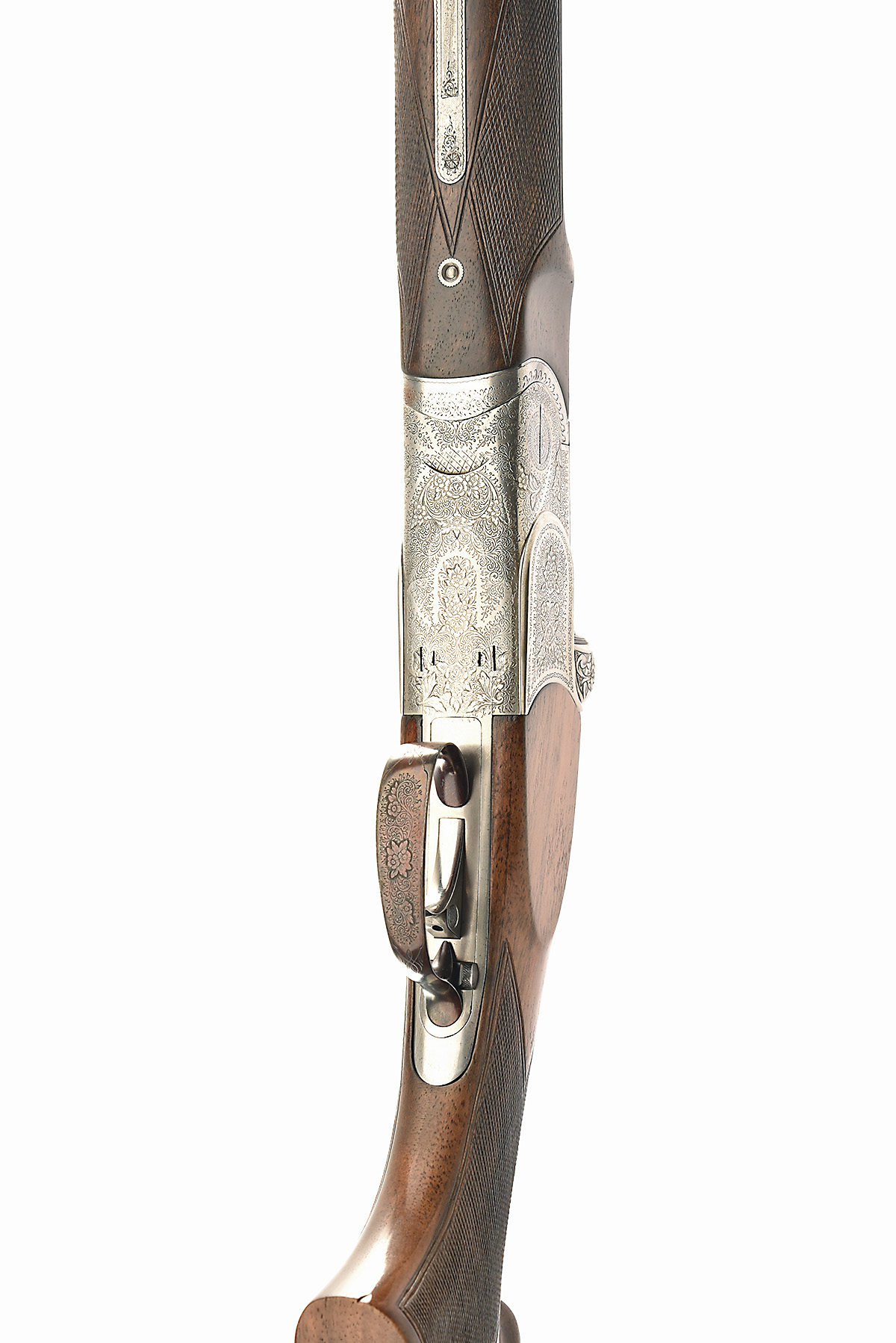 for 1975, 29 1/4in. nitro barrels with 10mm ventilated matt top-rib, 2 3/4in. chambers, bored approx. 1/2 and 3/4 choke, hold-open toplever, manual safety, trigger mounted barrel selector switch, profusely engraved with floral and scrollwork, bright finish, 14 5/8in. pistolgrip stock including 1in. recoil pad, weight 7lb. 8oz., in a universal case