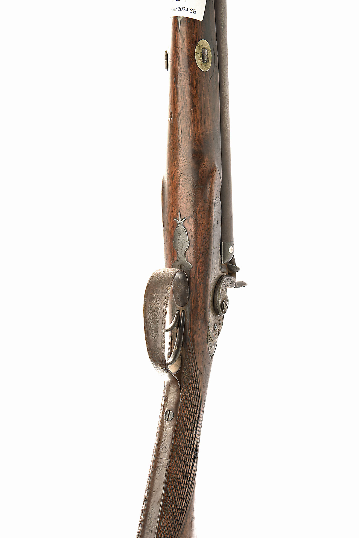 * A 16-BORE PERCUSSION DOUBLE-BARRELLED SPORTING-GUN SIGNED MORTIMER, LONDON, no visible serial number, circa 1845, with 30in. barrels, the top-rib signed 'MORTIMER, LONDON'. bar-action locks with dipped tails and signed 'MORTIMER', miss-matched hammers, walnut half-stock rechequered at the wrist (crack above left lock), missing ramrod, worn