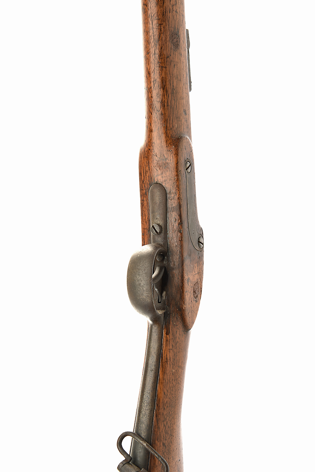 * A .577 PERCUSSION SHORT-RIFLE SPURIOUSLY SIGNED TOWER, no visible serial number, probably Belgian circa 1860, with 30in. barrel rifled in five grooves, ladder from rear-sight absent, bar-action lock overstamped with the date '1864' and also overstamped 'TOWER' and with a Victorian crown, walnut full-stock, Belgian form brass furniture except two iron barrel-bands, missing ramrod