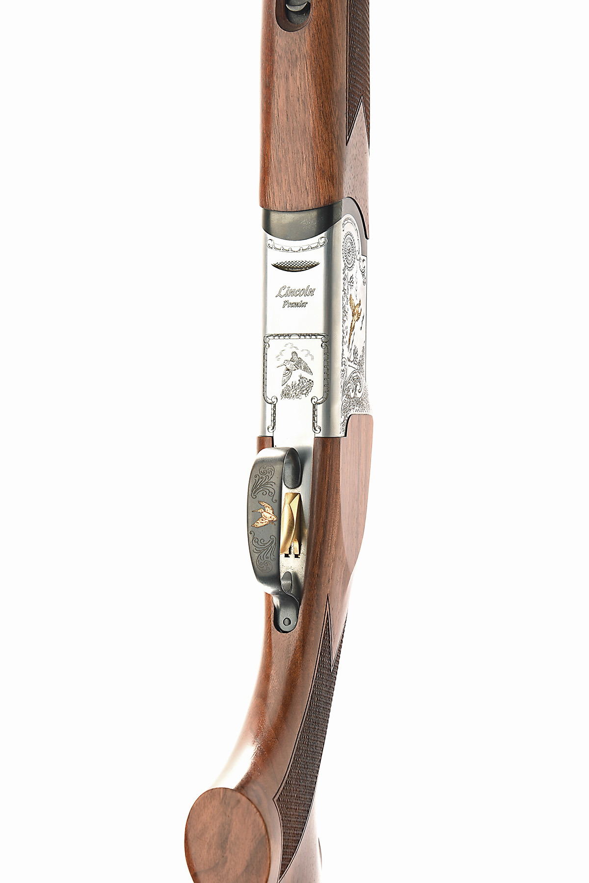 LINCOLN 12-BORE 'PREMIER' SINGLE-TRIGGER OVER AND UNDER EJECTOR, serial no. 203349, for 2005, 30in. nitro barrels, with 7mm ventilated matt top-rib (missing bead fore-sight), 3in. chambers, multichokes (with spares), hold-open toplever, automatic safety with integral barrel selector switch, gold-washed trigger, scroll engraving with gilt-inlaid game scenes of pheasant woodcock and duck, 14 5/8in. pistolgrip stock, weight 7lb. 15oz., in its universal case