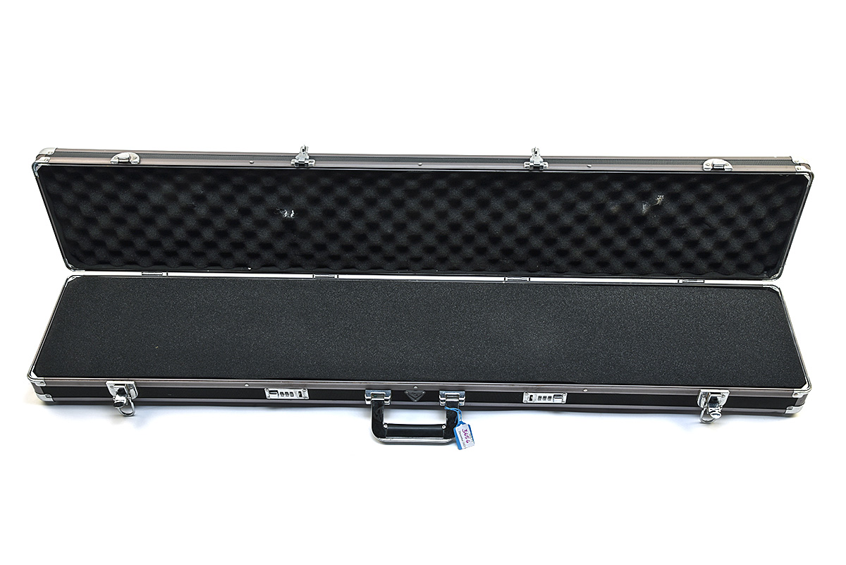 AN UNSIGNED FULL-LENGTH ALUMINIUM GUNCASE, foam-lined interior, measuring approx. 48in. x 8 1/2in., two clasp and two combination locks