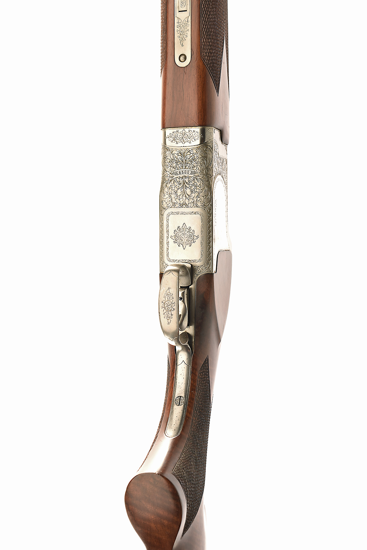 WINCHESTER 12-BORE 'MOD 6500 SPORTER' SINGLE-TRIGGER OVER AND UNDER EJECTOR, serial no. K548152E, circa 1986, 30in. nitro reproved barrels with 10mm ventilated matt top-rib and ventilated mid-rib, 2 3/4in. chambers, bored approx. imp. cyl. and 1/4 choke, hold-open toplever, manual safety with integral barrel selector switch, adjustable trigger, partially engraved with bold acanthus scrollwork, bright silver finish with matted standing breech and toplever, 14 3/4in. pistolgrip stock including buttplate, weight 7lb. 8oz., in a Beretta universal case