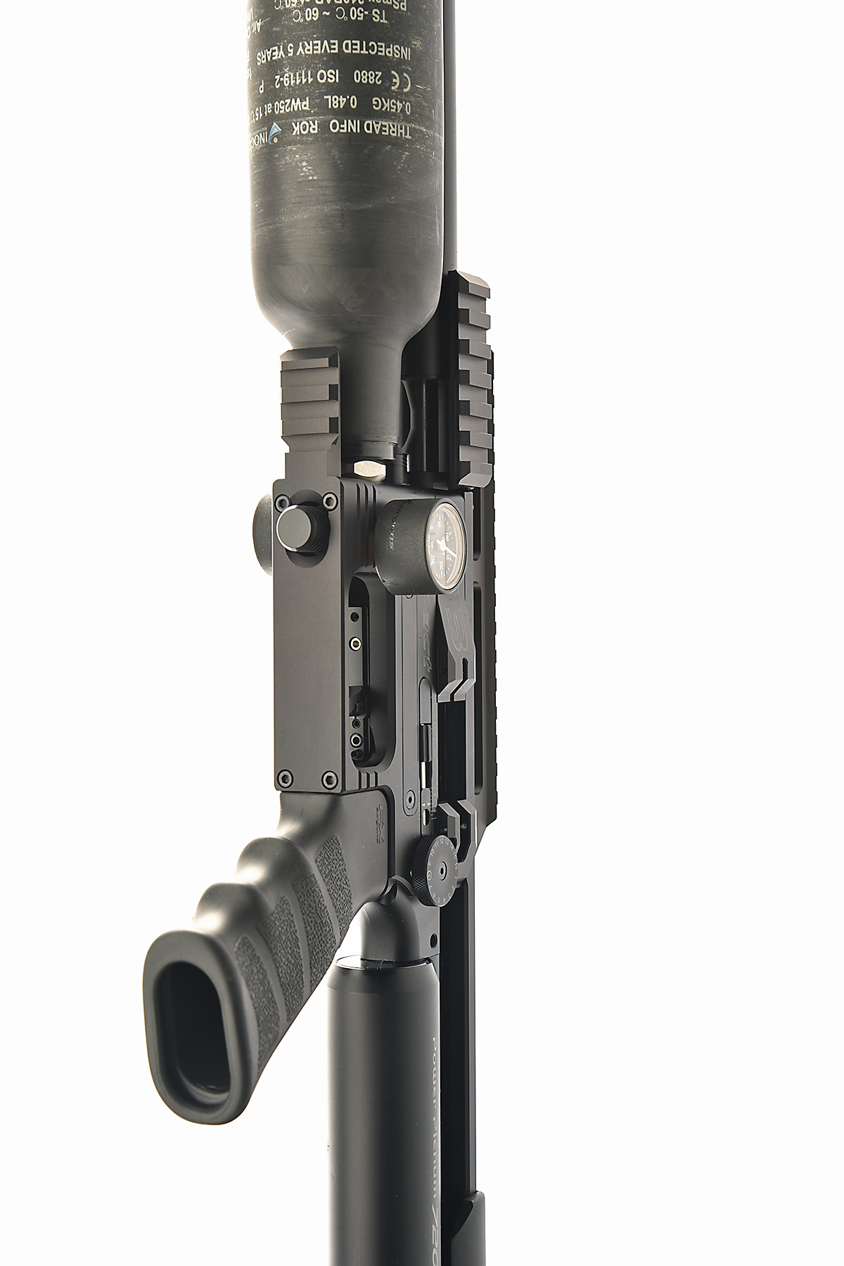 with 30in. barrel including sound moderator, lever-action receiver with detachable rotary magazine housed in machined alloy butt-stock, soft rubber pistol-grip, carbon fibre-covered air-chamber, appearing little used (tested), in its makers abs flight case with instructions and filling adaptor