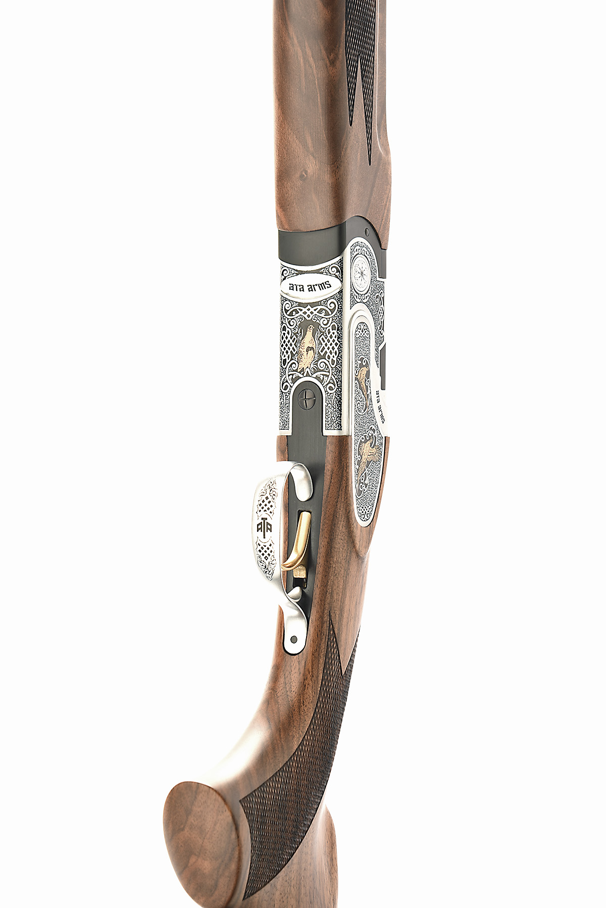 A VIRTUALLY UNUSED ATA ARMS 20-BORE 'SP ELEGANT GOLD' SIDEPLATED SINGLE-TRIGGER OVER AND UNDER EJECTOR, serial no. 21-S50456, circa 2021, 30in. nitro reproved high performance steel barrels with 6mm ventilated matt top-rib, 3in. chambers, multichokes (with spares), hold-open toplever, automatic safety with integral barrel selector, gold-washed trigger, the action and decorative sideplates with gilt-inlaid game birds amid scrolling acanthus, 14 3/4in. pistolgrip stock including wooden buttplate, weight 6lb. 7oz., in its original carton