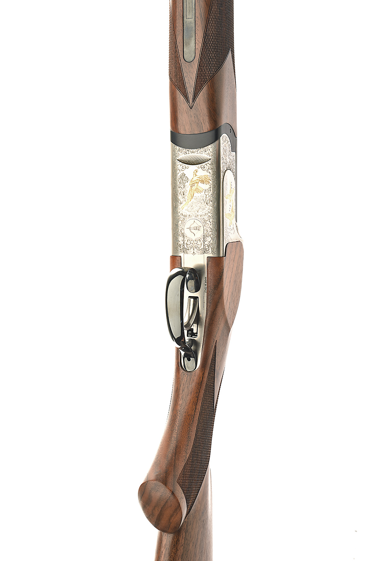 A VIRTUALLY UNUSED ANTONIO ZOLI 12-BORE 'COLUMBUS' SINGLE-TRIGGER OVER AND UNDER EJECTOR, serial no. 245768, for 2013, 29 1/2in. high performance steel proof nitro barrels with 10mm matt top-rib and ventilated mid rib, 3in. chambers, multichokes (with spares), hold-open toplever, manual safety with integral barrel selector, acanthus scrollwork surrounding gold-highlighted game scenes of partridge, pheasant and goose, bright finish, 14 5/8in. pistolgrip stock including buttplate, weight 7lb. 6oz., in its universal case with paperwork