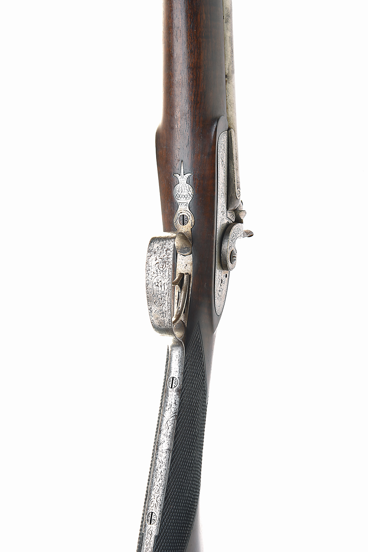 A 12-BORE PERCUSSION DOUBLE-BARRELLED SPORTING-GUN SIGNED SMITH, no visible serial number, circa 1850, with 30in. barrels (cleaned of finish), border and scroll engraved bar-action signed locks (brushed bright), walnut half-stock chequered at the wrist, period replacement ramrod (one thimble loose but present)