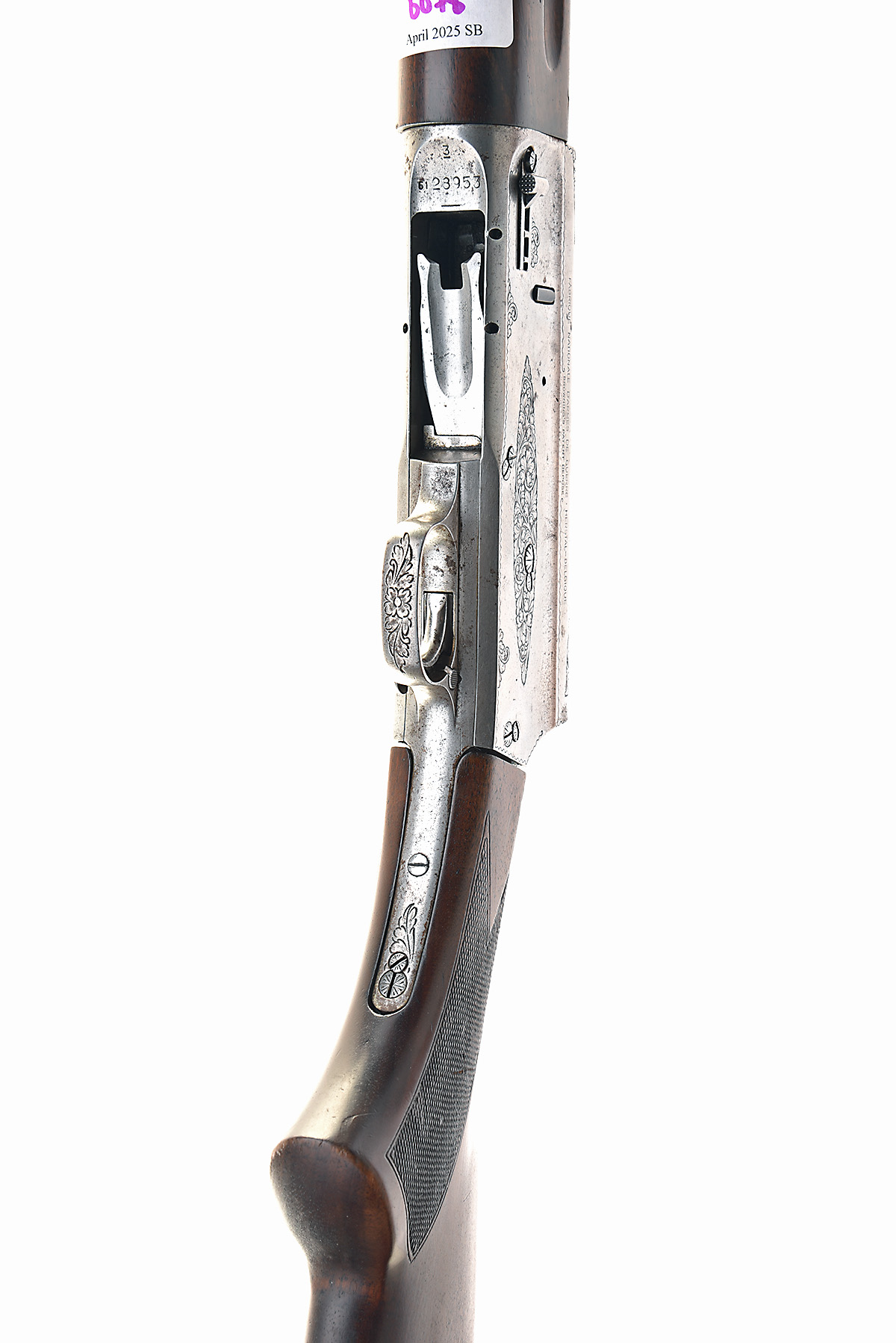 FABRIQUE NATIONALE 12-BORE 'AUTO-5' SEMI-AUTOMATIC SHOTGUN, serial no. 61 28953, for 1961, restricted magazine, 25 1/4in. nitro barrel with 8mm raised ventilated matt rib, 2 3/4in. chamber, bored approx. 1/4 choke, manual push-button safety, magazine cut-off switch, acanthus scroll engraving, brushed bright finish, 14 1/4in. replacement stock including trademark buttplate, sling swivels, weight 8lb. 2oz.